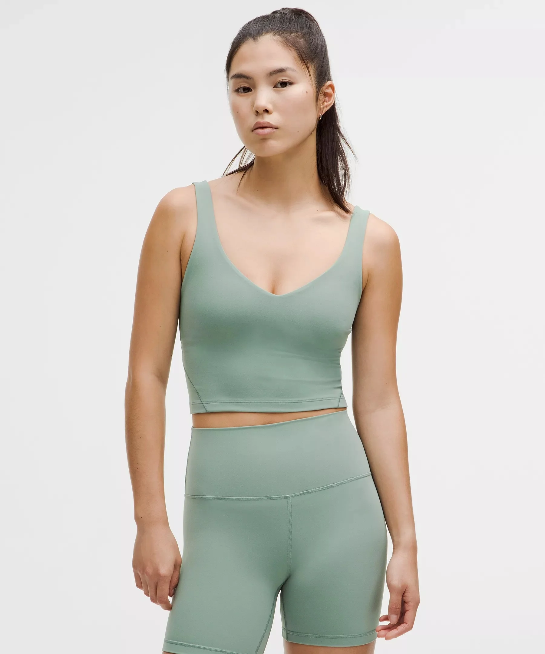 Feels Buttery-Soft and Weightless, Nulu™ Fabric So buttery soft, it feels weightless Four-way stretch Sweat-wicking Breathable Added Lycra® fibre for stretch and shape retention Light Support Sizes 0-14 fit A/B cups Sizes 16-20 fit C/D cups Tight fit contours your body Cropped length is cut above the waist—perfect with high-rise pants Intended for low-impact activities Product Features Built-in shelf bra for added support and coverage Pockets for optional, removable cups Material and care Materials Middle Layer: 89% Nylon11% Elastane Body: 81% Nylon19% Lycra Elastane Liner: 81% Nylon19% Lycra Elastane Care Wash with like colours Machine wash cold Do not bleach Tumble dry low Do not iron Do not dry clean Imported