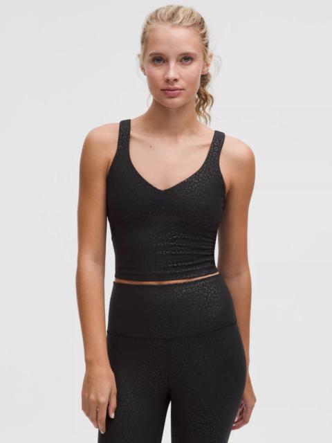 Designed for Yoga Feels Buttery-Soft and Weightless, Nulu™ Fabric - So buttery soft, it feels weightless - Four-way stretch - Sweat-wicking - Breathable - Added Lycra® fibre for stretch and shape retention Light Support - Sizes 0-14 fit A/B cups - Sizes 16-20 fit C/D cups - Tight fit contours your body - Cropped length is cut above the waist—perfect with high-rise pants - Intended for low-impact activities Product Features - Built-in shelf bra for added support and coverage - Pockets for optional, removable cups Material and care Materials Bra Lining: 81% Nylon19% Lycra Elastane - Body: 80% Nylon20% Lycra Elastane - Middle Layer: 89% Nylon11% Elastane Care Wash With Like Colors - Do Not Bleach - Line Dry - Do Not Iron - Do Not Dry Clean - Wash With Like Colors