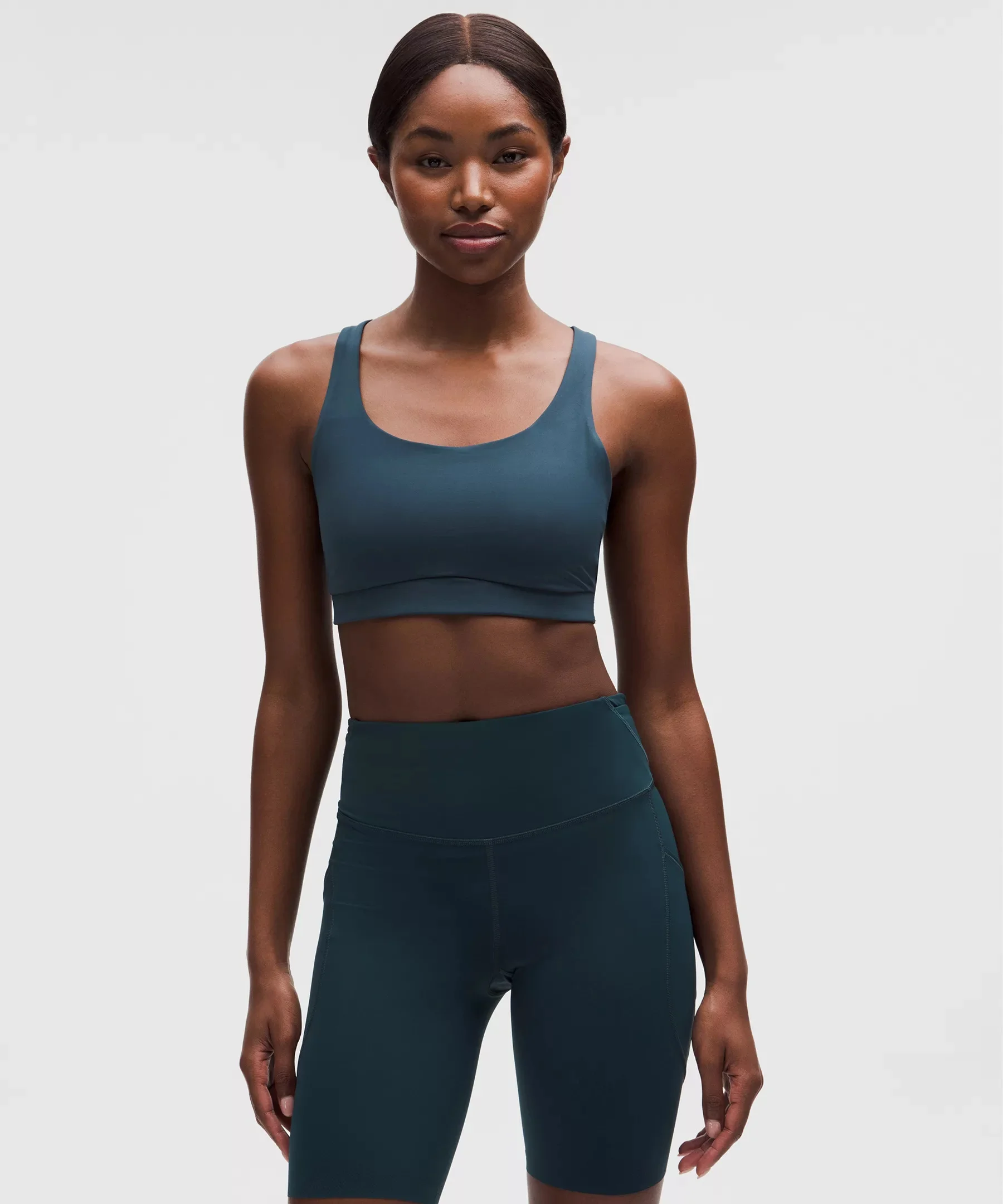 Designed for Yoga and Training Smooth, Sweat-Wicking Fabric - Sweat-wicking - Smooth - Four-way stretch - Quick-drying - Added elastane improves stretch and shape retention Medium Support, B–D Cups - Intended for medium-impact activities Product Features - Back crossover straps are placed to clear shoulder blades for minimal distractions and have varied widths for dimension - Lightweight elastic underband is thoughtfully constructed with low-profile seams for optimal comfort - Pockets for optional, removable cups Material and care Materials Bra: 77% Recycled Nylon23% Elastane - Bra Lining: Face: 89% Recycled Polyester, 11% Elastane Care Machine Wash Cold - Do Not Bleach - Tumble Dry Low - Do Not Iron - Do Not Dry Clean - Wash With Like Colors