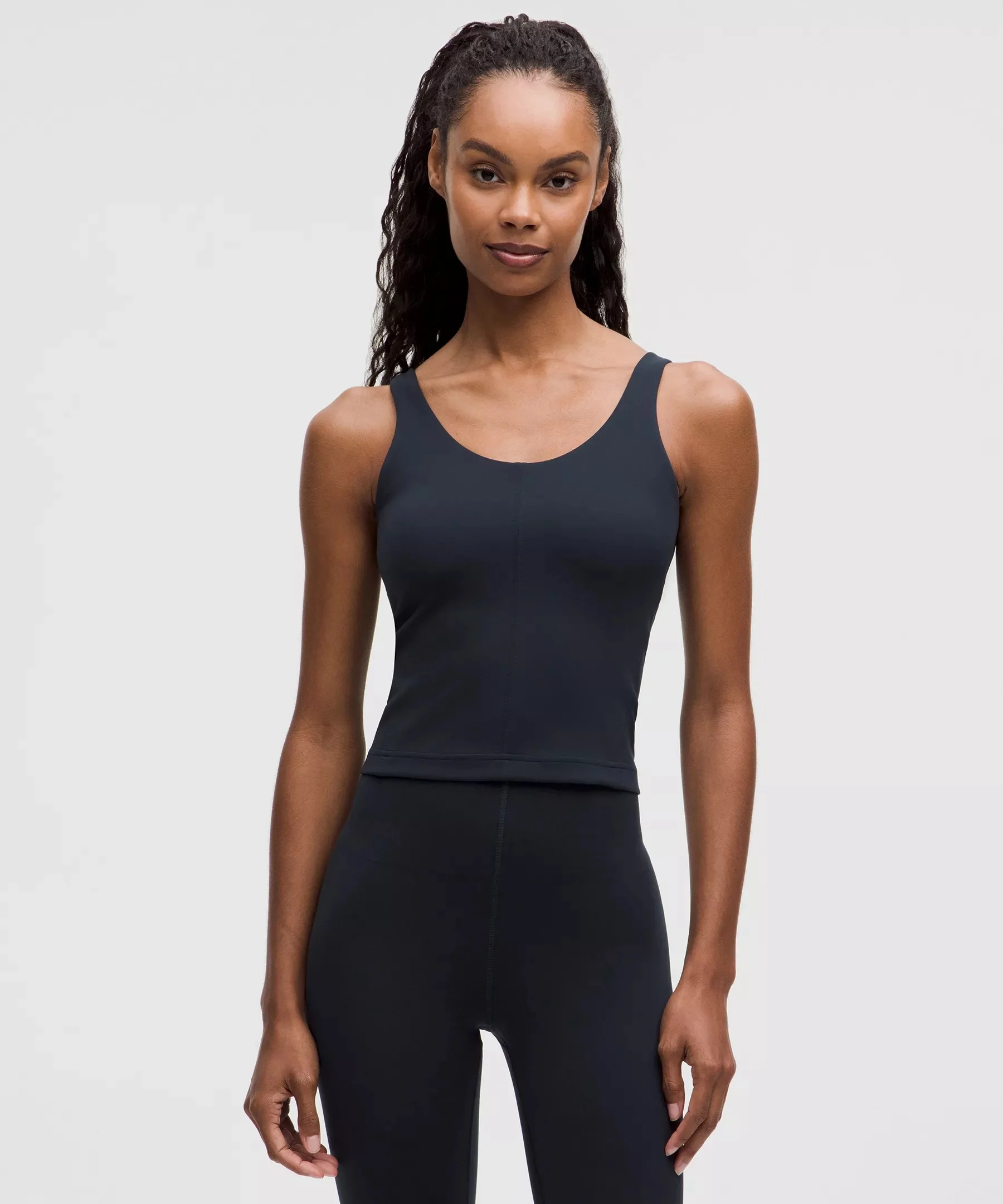 Designed for Training Smooth and Supportive, Ultralu™ Fabric - Smooth support that moulds to your body - Sweat-wicking - Quick-drying - Four-way stretch - Added Lycra® fibre for stretch and shape retention Medium Support, B/C Cups - Intended to provide medium support for B/C cups - Tight fit contours your body - Waist length is not too short, not too long, just right around the waistband - Intended for medium-impact activities Product Features - Built-in shelf bra for added support and coverage - Pockets for optional, removable cups Material and care Materials Body: 76% Nylon24% Lycra Elastane - Cup Lining: 90% Recycled Polyester10% Lycra Elastane - Bra Lining: 75% Recycled Nylon25% Elastane Care Wash With Like Colors - Do Not Bleach - Tumble Dry Low - Do Not Iron - Do Not Dry Clean - Wash With Like Colors
