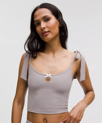 Designed for Training Feels Buttery-Soft and Weightless, Nulu™ Fabric - So buttery soft, it feels weightless - Four-way stretch - Sweat-wicking - Breathable - Added Lycra® fibre for stretch and shape retention Light Support, A/B Cups - Intended to provide light support for A/B cups - Tight fit contours your body - Cropped length is cut above the waist—perfect with high-rise pants - Intended for low-impact activities Product Features - Built-in shelf bra for added support and coverage - Pockets for optional, removable cups - Fixed-length straps with tie detail Material and care Materials Straps: 90% Nylon10% Lycra Elastane - Bra Lining: 81% Nylon19% Lycra Elastane - Body: 81% Nylon19% Lycra Elastane Care Machine Wash Cold - Do Not Bleach - Tumble Dry Low - Do Not Iron - Do Not Dry Clean - Wash With Like Colors