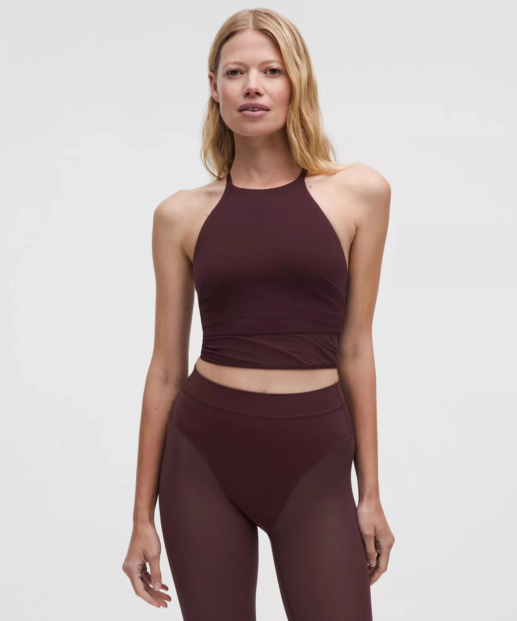 Designed for Yoga Feels Buttery-Soft and Weightless, Nulu™ Fabric - So buttery soft, it feels weightless - Four-way stretch - Sweat-wicking - Breathable - Added Lycra® fibre for stretch and shape retention Light Support, B/C Cups - Intended to provide light support for B/C cups - Tight fit contours your body - Cropped length is cut above the waist—perfect with high-rise pants - Intended for low-impact activities Product Features - Built-in shelf bra for added support and coverage - Pockets for optional, removable cups Material and care Materials Contrast: 64% Nylon36% Elastane - Middle Layer: 89% Recycled Nylon11% Elastane - Body: 81% Nylon19% Lycra Elastane - Bra Lining: 81% Nylon19% Lycra Elastane Care Machine Wash Cold - Do Not Bleach - Tumble Dry Low - Do Not Iron - Do Not Dry Clean - Wash With Like Colors