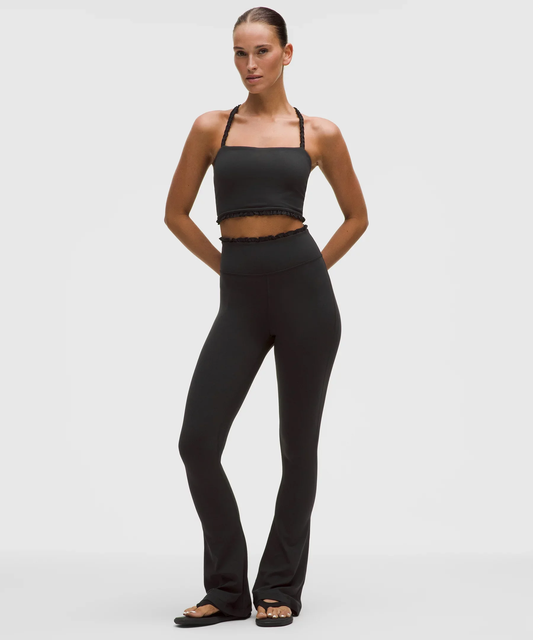 Designed for Training Feels Buttery-Soft and Weightless, Nulu™ Fabric - So buttery soft, it feels weightless - Four-way stretch - Sweat-wicking - Breathable - Added Lycra® fibre for stretch and shape retention Super-High Rise, Full Length - Flares out from the knee to hem - Full length intended to skim the floor Material and care Materials Gusset: 81% Nylon19% Lycra Elastane - Body: 81% Nylon19% Lycra Elastane - Top Panel: 90% Nylon10% Lycra Elastane Care Machine Wash Cold - Do Not Bleach - Tumble Dry Low - Do Not Iron - Do Not Dry Clean - Wash With Like Colors
