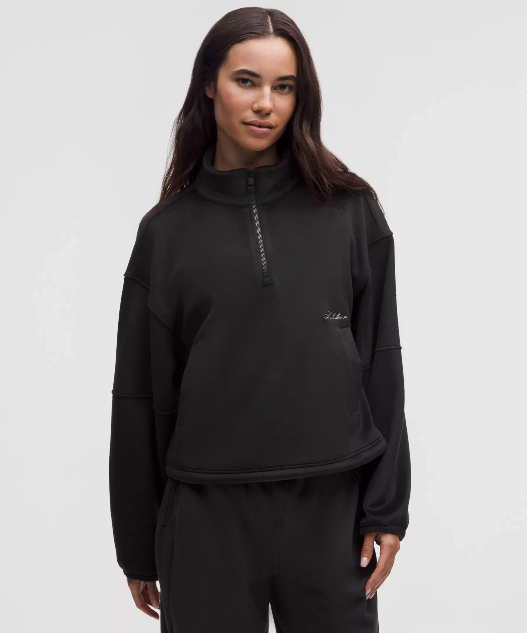Designed for Casual Cozy, Cotton-Blend Stretch Fleece Fabric - Rich velour texture on the outside - Smooth finish next to skin - 100% of the polyester in this product is recycled (excluding trims) Oversized Fit, Waist Length - An exaggerated fit that feels extra roomy - Not too short, not too long, just right around the waistband Product Features - Kangaroo pocket with a hidden phone sleeve - Cinchable shockcord hem - High neck for added coverage Material and care Materials Lining: 95% Cotton5% Elastane - Body: 67% Polyester (recycled)29% Cotton4% Elastane Care Machine Wash Cold - Do Not Bleach - Tumble Dry Low - Do Not Iron - Do Not Dry Clean - Wash With Like Colors