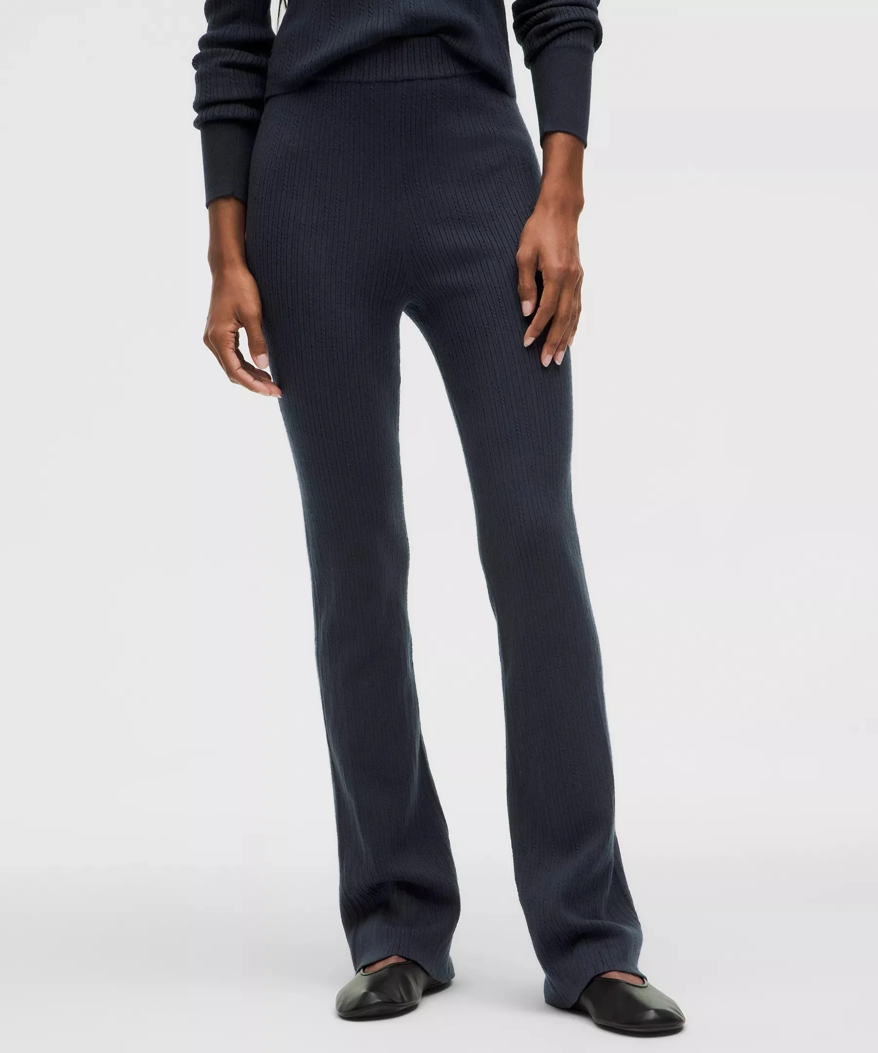 Ribbed, Merino Wool Fabric Ribbed texture Naturally thermoregulating Soft against skin Be gentle and treat with care. Please refer to the material and care section below for full fibre content information and wash instructions Mid Rise, Full Length Full length intended to sit at ankle Tight fit that flares out subtlety from the knee to hem Material and care Materials All: 85% Merino Wool14% Polyamide1% Elastane Care Wash separately Machine wash cold gentle Do not bleach Lay flat to dry Do not iron Do not dry clean Imported