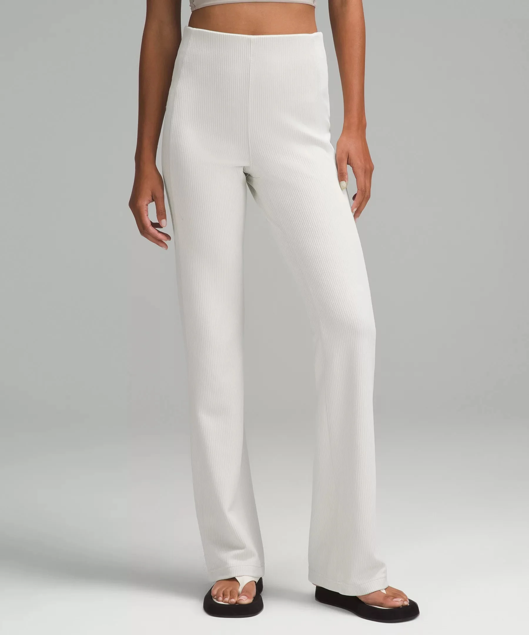 Peach-Fuzz Soft, Ribbed Softstreme™ Fabric Peach-fuzz soft, ribbed texture Smooth surface next to skin Quick-drying Machine washable. Water drops can easily mark this fabric—a simple wash will remove them 100% of the polyester in this product is recycled (excluding trims) Fabric is derived from responsibly sourced wood-based materials that support the protection of ancient and endangered forests High Rise, Full Length Flares out from the knee to hem 33" inseam, intended to skim the floor for heights of 5'5"-5'8" Product Features Back drop-in pocket Wide, ribbed internal waistband is soft next to skin, stays put, and creates a sleek look Material and care Materials Body: 67% Recycled polyester28% Lenzing® modal5% Elastane Care Wash separately Machine wash cold gentle Do not bleach Lay flat to dry Do not iron Do not dry clean Imported
