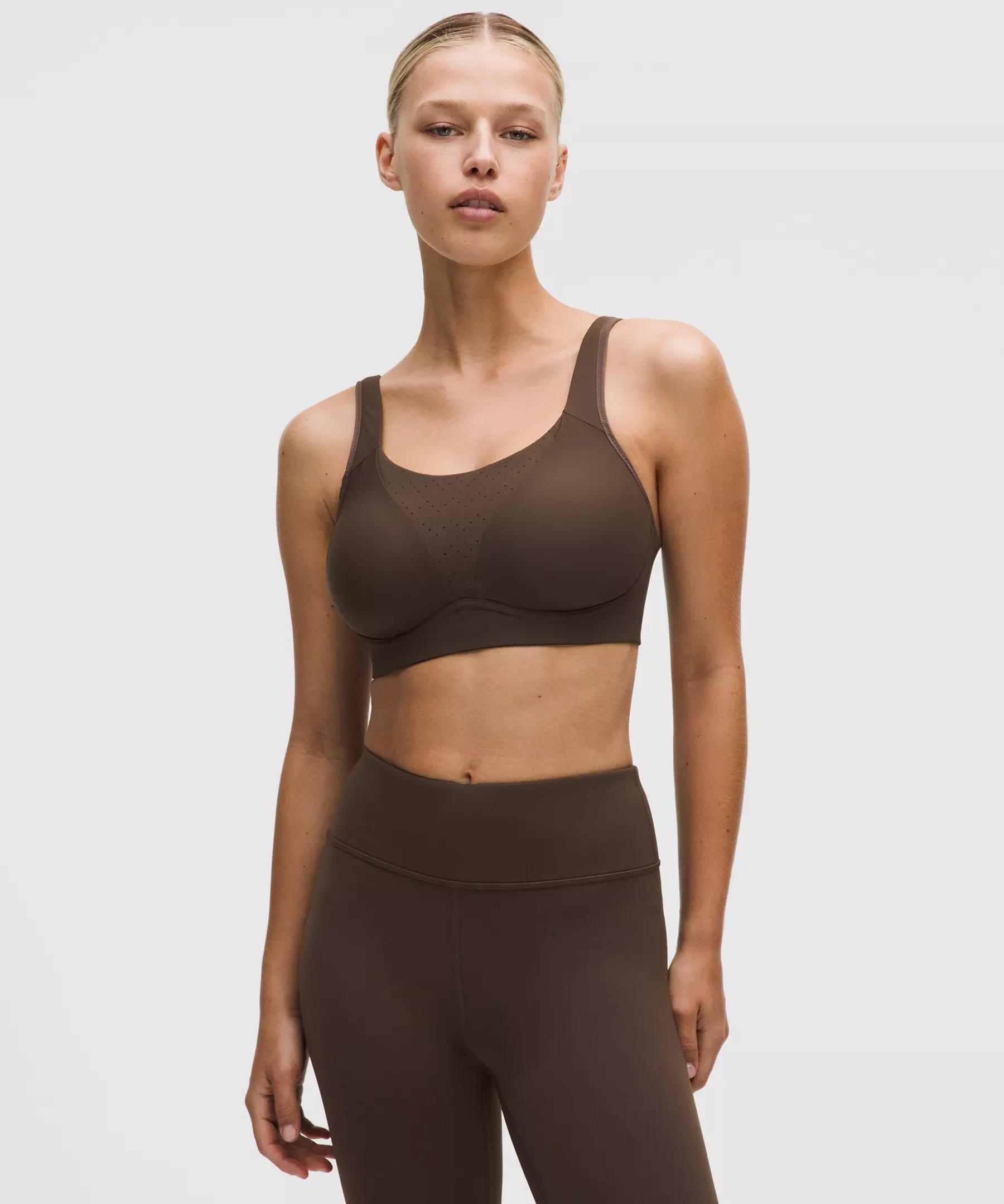 Designed for Running Sweat-Wicking Fabric - Sweat-wicking - Four-way stretch - Added Lycra® fibre for shape retention High Support, B–G Cups - Intended for high-impact activities Product Features - Straps are padded for comfort - Adjustable, crossable straps - Hook-and-eye closure for a customized underband fit - Soft, brushed underband Material and care Materials Wing: Face: 73% Nylon, 27% Xtra Life Lycra ElastaneBack: 73% Nylon, 27% Xtra Life Lycra Elastane - Back Lining: 71% Nylon29% Elastane - Bra: 59% Nylon41% Xtra Life Lycra Elastane - Cup: Cup Shell: 100% PolyesterCup Foam: 100% Polyurethane FoamCup Liner: 100% Polyester Care Machine Wash Cold - Do Not Bleach - Line Dry - Do Not Iron - Do Not Dry Clean - Wash With Like Colors
