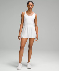 Lightweight Fabric Fabric on the tank is lightweight, four-way stretch, sweat-wicking, and quick-drying Pleated Swift fabric on the skirt is lightweight, sweat-wicking, and quick-drying Medium Support, B/C Cups Intended for medium-impact activities Tight fit contours your body Above the knee length falls to just above the centre of the kneecap Product Features Built-in shelf bra for added support and coverage Pockets for optional, removable cups Dress is unlined. For additional coverage on the court, wear with a pair of tight shorts (sold separately) Material and care Materials Upper Mesh Panel: 71% Nylon29% Elastane Lower Mesh Panel: 89% Nylon11% Elastane Top: 78% Nylon22% Elastane Trim: 82% Nylon18% Elastane Bottom: 86% Polyester14% Elastane Bra Lining: 56% Polyester33% Coolmax Polyester11% Lycra Elastane Care Wash with like colours Machine wash cold Do not bleach Tumble dry low Do not iron Do not dry clean Imported
