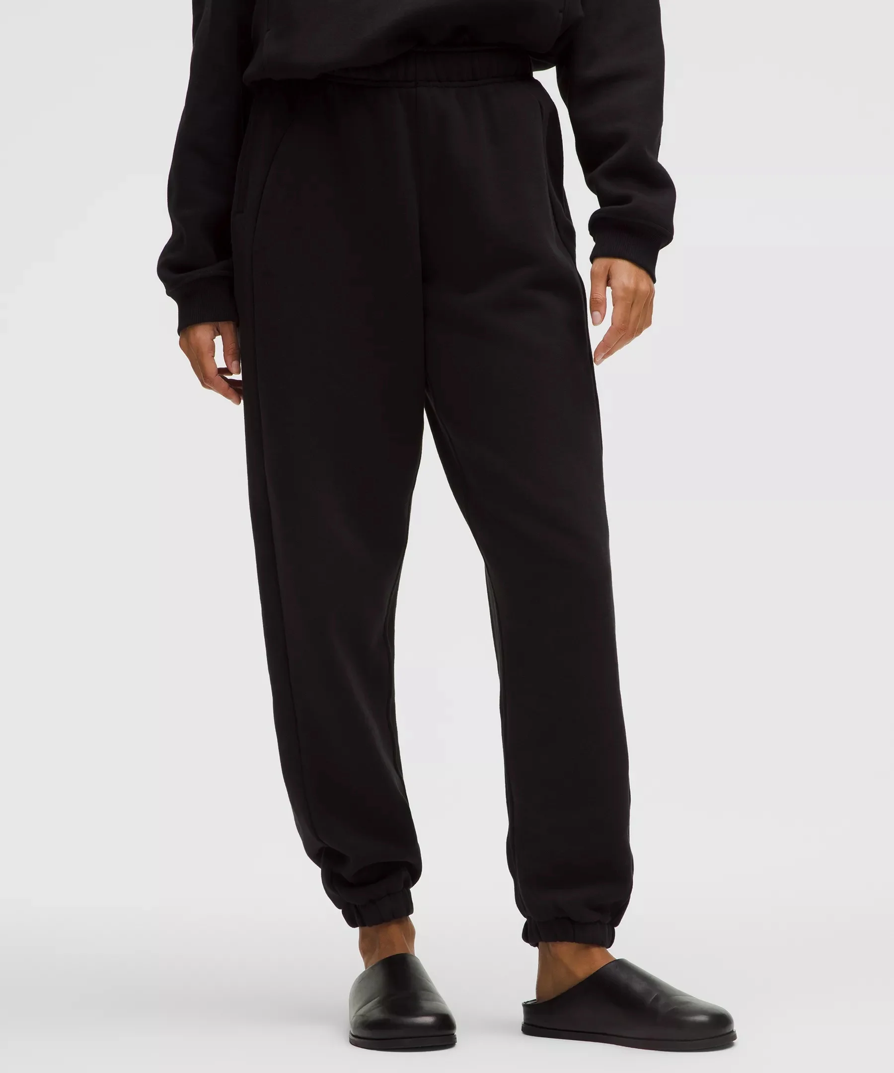 Naturally Breathable, Cotton-Blend Fleece Fabric Naturally breathable Soft against skin Lightweight warmth Mid Rise, Full Length Oversized fit is exaggerated and feels extra roomy. Size up for a looser, baggier fit Intended to sit at ankle for heights of 5'5"-5'8" Product Features Hand pockets with hidden card sleeve Cinch the interior drawcord to adjust your fit. Roll the waistband down to wear the drawcord on the outside Material and care Materials Pocket: 95% Cotton5% Elastane Body: 70% Cotton30% Recycled Polyester Care Wash with like colours Machine wash cold Do not bleach Tumble dry low Do not iron Do not dry clean