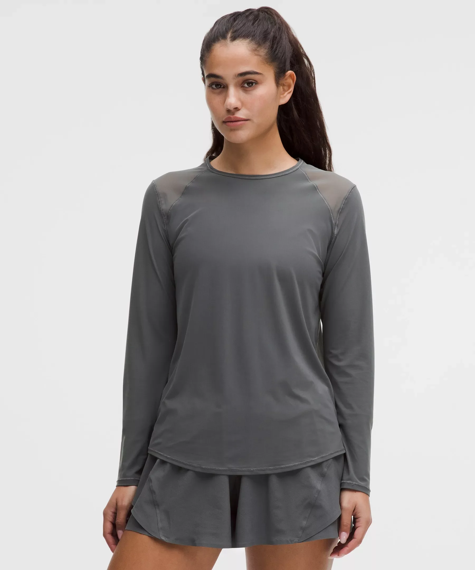 Designed for Running Sweat-Wicking Fabric - Sweat-wicking - Four-way stretch - Quick-drying - Mesh fabric panels for ventilation Classic Fit, Hip Length - An easy fit that floats away from your body - Sits below the waistband for moderate, everyday coverage Material and care Materials Body: 76% Nylon24% Elastane - Mesh: 79% Nylon21% Xtra Life Lycra Elastane Care Machine Wash Cold - Do Not Bleach - Tumble Dry Low - Do Not Iron - Do Not Dry Clean - Wash With Like Colors