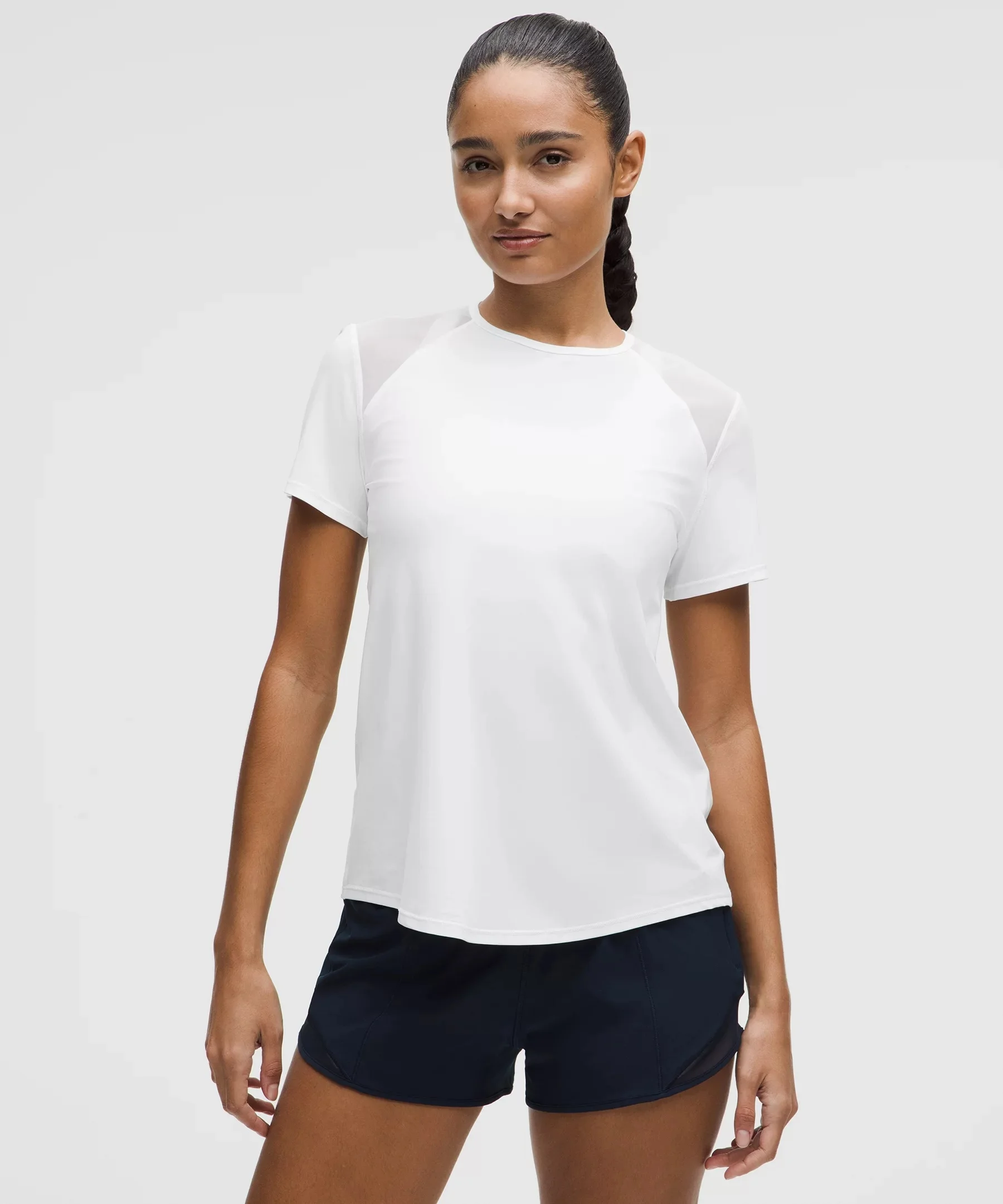 Designed for Running Sweat-Wicking Fabric - Sweat-wicking - Four-way stretch - Quick-drying - Mesh fabric panels for ventilation Classic Fit, Hip Length - An easy fit that floats away from your body - Sits below the waistband for moderate, everyday coverage Material and care Materials Body: 76% Nylon24% Elastane - Front Upper Panel: 79% Nylon21% Xtra Life Lycra Elastane Care Machine Wash Cold - Do Not Bleach - Tumble Dry Low - Do Not Iron - Do Not Dry Clean - Wash With Like Colors