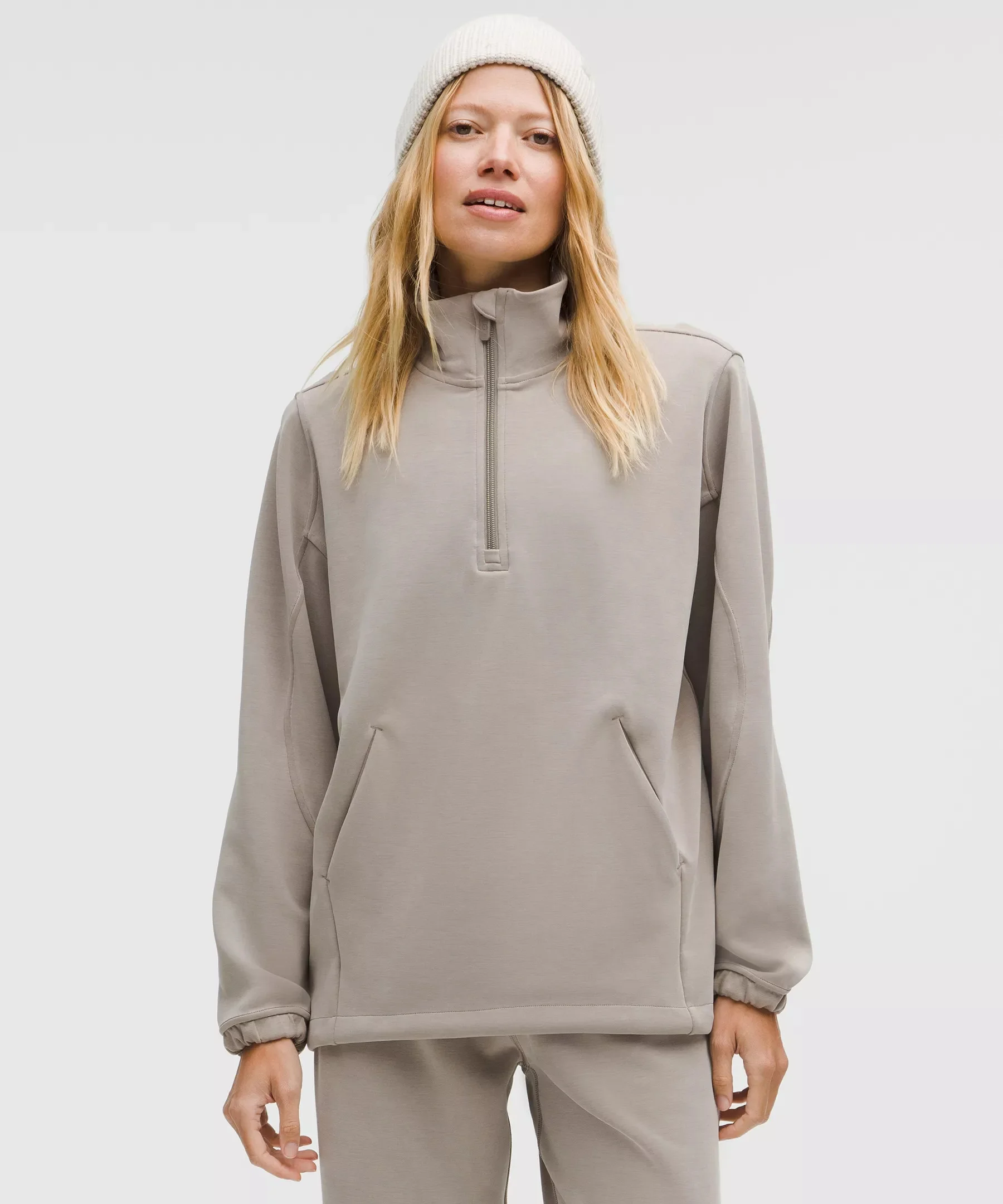 Designed for Casual Peach-Fuzz Soft, Softstreme™ Fabric - Peach-fuzz soft texture - Feels smooth next to skin - Weighty drape - Machine washable. Water drops can easily mark this fabric—a simple wash will remove them - Fabric is derived from wood-based materials from well-managed forests - 100% of the polyester in this product is recycled (excluding trims) Oversized Fit, Hip Length - An exaggerated fit that feels extra roomy - Sits below the waistband for moderate, everyday coverage Product Features - Kangaroo pocket with a hidden card sleeve - Zipper garage keeps chafe in check - Cinchable hem Material and care Materials Cuff: 53% Recycled Polyester38% Modal9% Elastane - Body: 53% Recycled Polyester38% Modal9% Elastane - Front Lining: 100% Cotton Care Machine Wash Cold - Do Not Bleach - Tumble Dry Low - Do Not Iron - Do Not Dry Clean - Wash Inside Out With Zipper Fully Closed - Wash Separately