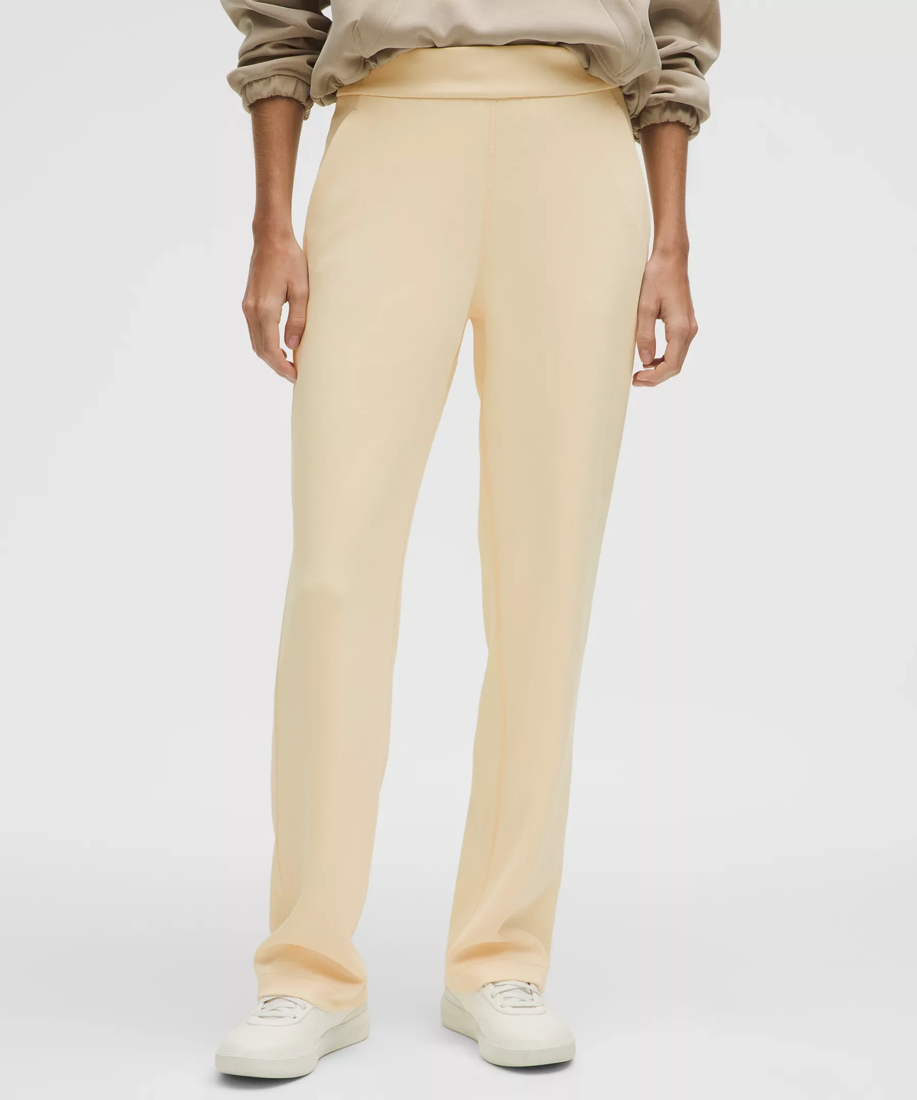 Designed for Casual Peach-Fuzz Soft, Softstreme™ Fabric - Peach-fuzz soft texture - Feels smooth next to skin - Four-way stretch - Weighty drape - Machine washable. Water drops can easily mark this fabric—a simple wash will remove them - 100% of the polyester in this product is recycled (excluding trims) - Fabric is derived from wood-based materials from well-managed forests High Rise, Full Length - Slim fit skims your body - Falls straight down from hip to hem - 31" inseam, intended to skim the floor for heights of 5'5"–5'8" Product Features - Hand pockets, one with a hidden card sleeve - Elastic waistband with a hidden drawcord Material and care Materials Pocket Lining: 86% Polyester (recycled)14% Elastane - Waistband: 53% Polyester (recycled)38% Modal9% Elastane - Body: 53% Polyester (recycled)38% Modal9% Elastane Care Machine Wash Cold - Do Not Bleach - Tumble Dry Low - Do Not Iron - Do Not Dry Clean - Turn Garment Inside Out - Wash Separately