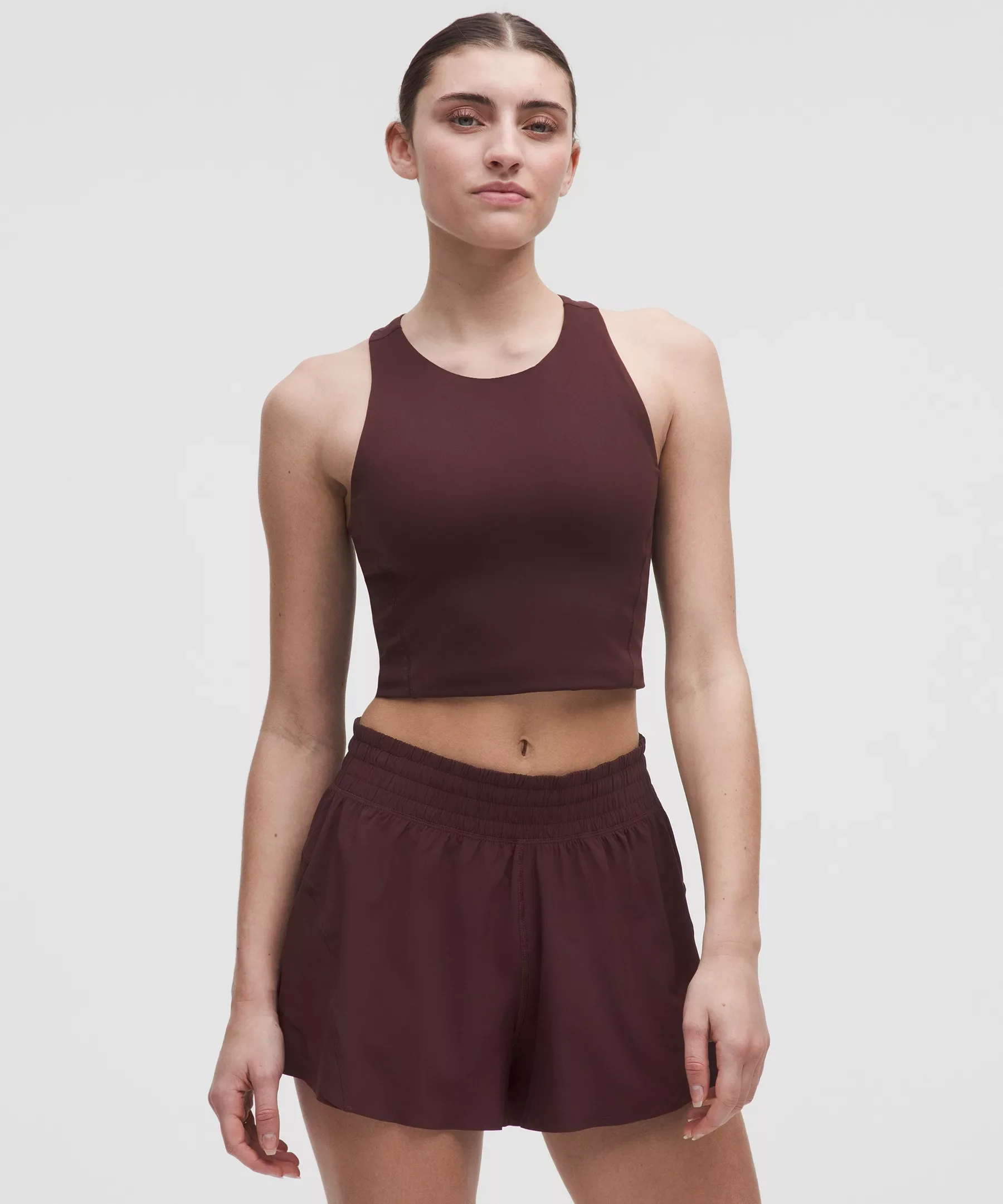 Designed for Running Soft, Sleek Fabric - Soft, sleek, and supportive - Four-way stretch - Sweat-wicking - Quick-drying - Has a smooth, lightweight feel with a matte finish Medium Support, B/C Cups - Intended to provide medium support for a B/C cup - Tight fit contours your body - Cropped length is cut above the waist—perfect with high-rise pants - Intended for medium-impact activities Product Features - Built-in shelf bra for added support and coverage - Pockets for optional, removable cups - Racerback shape allows for full range of movement - Zippered back pocket holds a phone and other essentials Material and care Materials Body: 68% Nylon32% Elastane - Cup Liner: 89% Nylon (recycled)11% Elastane - Bra Lining: 90% Polyester (recycled)10% Lycra Elastane Care Machine Wash Cold - Do Not Bleach - Tumble Dry Low - Do Not Iron - Do Not Dry Clean - Wash With Like Colors