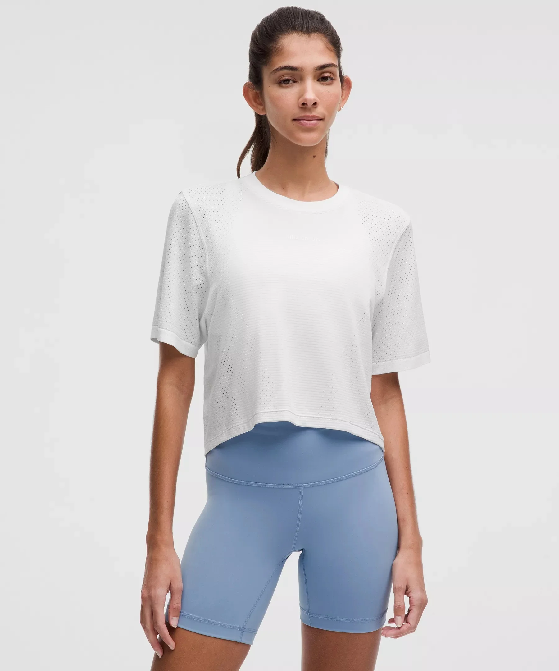Designed for Running and Training Skip-the-Chafe, Flat-Seam Construction - Seams are flat to reduce chafe - Lightweight - Sweat-wicking - Four-way stretch - Integrated open-hole mesh ventilation to increase breathability Relaxed Fit, Cropped Length - A loose fit with a little extra room - Cut above the waist—perfect with high-rise pants Product Features - Silverescent™ technology, powered by X-STATIC®, inhibits the growth of odour-causing bacteria on the garment Material and care Materials All: 65% Nylon32% Recycled Polyester3% X-Static Nylon Care Machine Wash Cold - Do Not Bleach - Tumble Dry Low - Do Not Iron - Do Not Dry Clean - Contains biocidal silver nitrate (nano) Inhibits odour-causing bacteria, Wash With Like Colors