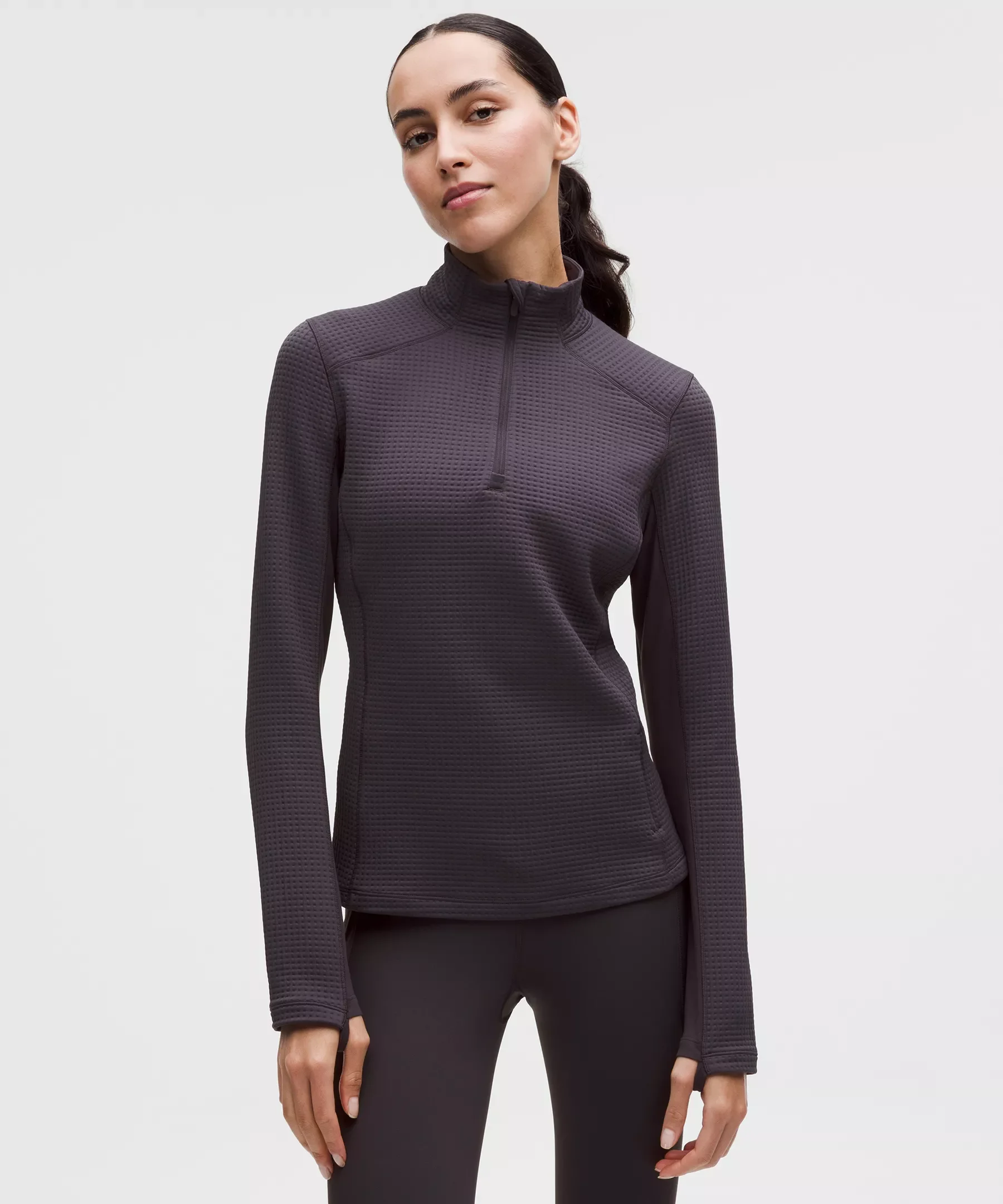 Designed for Running Soft, Warm Double-Knit Fabric - Soft - Warm - Sweat-wicking - Waffle texture - Underarm panel is made of stretchy Rulu™ fabric for breathability and ease of movement - 100% of the polyester and nylon in this product is recycled (excluding trims) Slim Fit, Hip Length - Skims your body - Sits below the waistband for moderate, everyday coverage Product Features - Zippered pocket - Thumbholes help keep sleeves down and hands warm - Zipper garage keeps chafe in check Material and care Materials Body: 100% Polyester (recycled) - Contrast: 92% Nylon (recycled)8% Lycra Elastane Care Machine Wash Cold - Do Not Bleach - Tumble Dry Low - Do Not Iron - Do Not Dry Clean - Wash With Like Colors