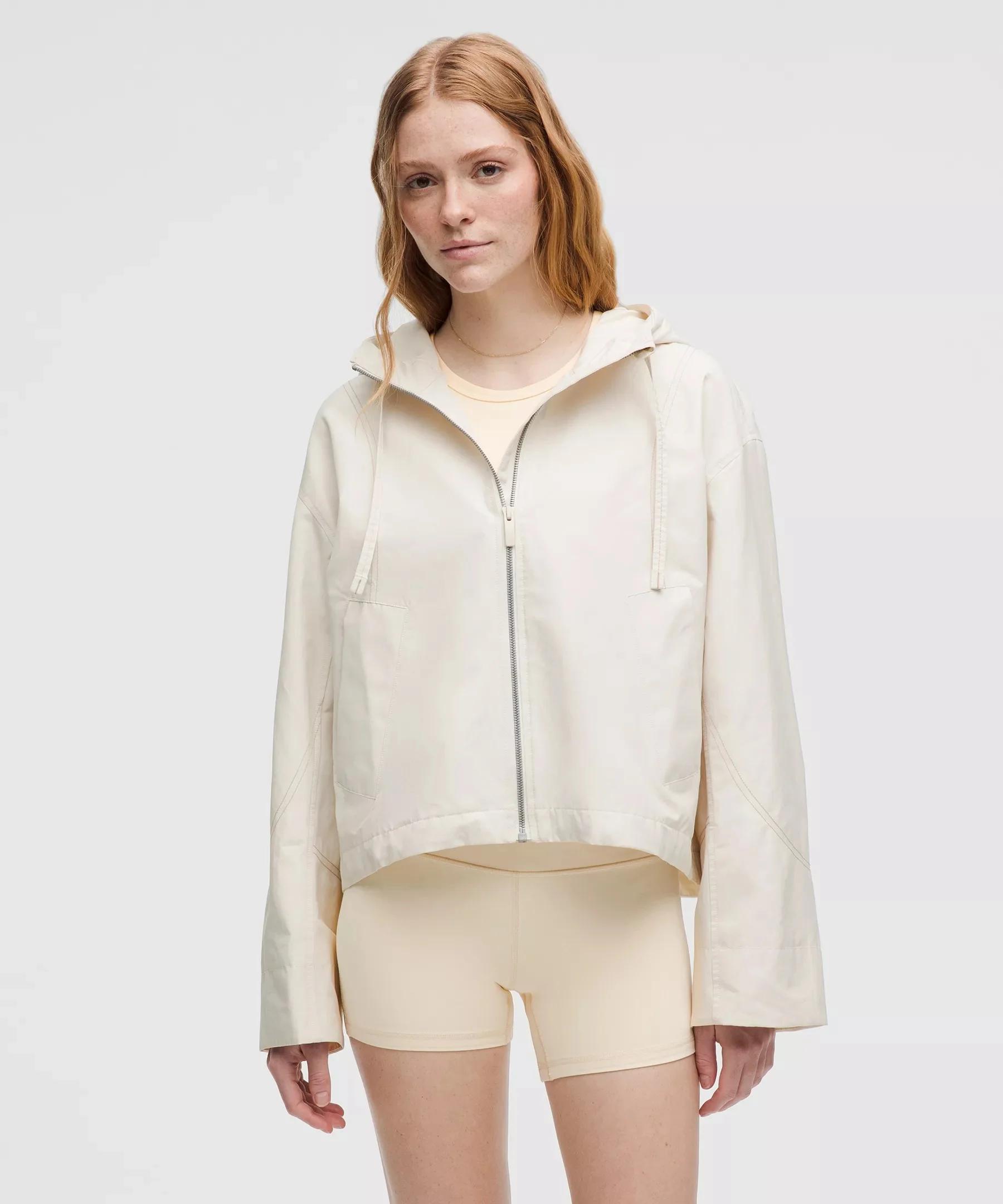 Water-Resistant, Cotton-Blend Fabric Water-resistant Windproof 100% of the polyester in this product is recycled (excluding trims) Oversized Fit, Cropped Length Oversized fit is purposefully large with exaggerated proportions. Size down if you prefer a slimmer fit Product Features Hand pockets have a hidden phone sleeve Drop-in interior pockets Cinchable hood Cinchable hem Material and care Materials Body: 54% Organic Cotton46% Recycled Polyester Lining: 100% Recycled Polyester Care Wash with like colours Machine wash cold Do not bleach Tumble dry low Do not iron Do not dry clean