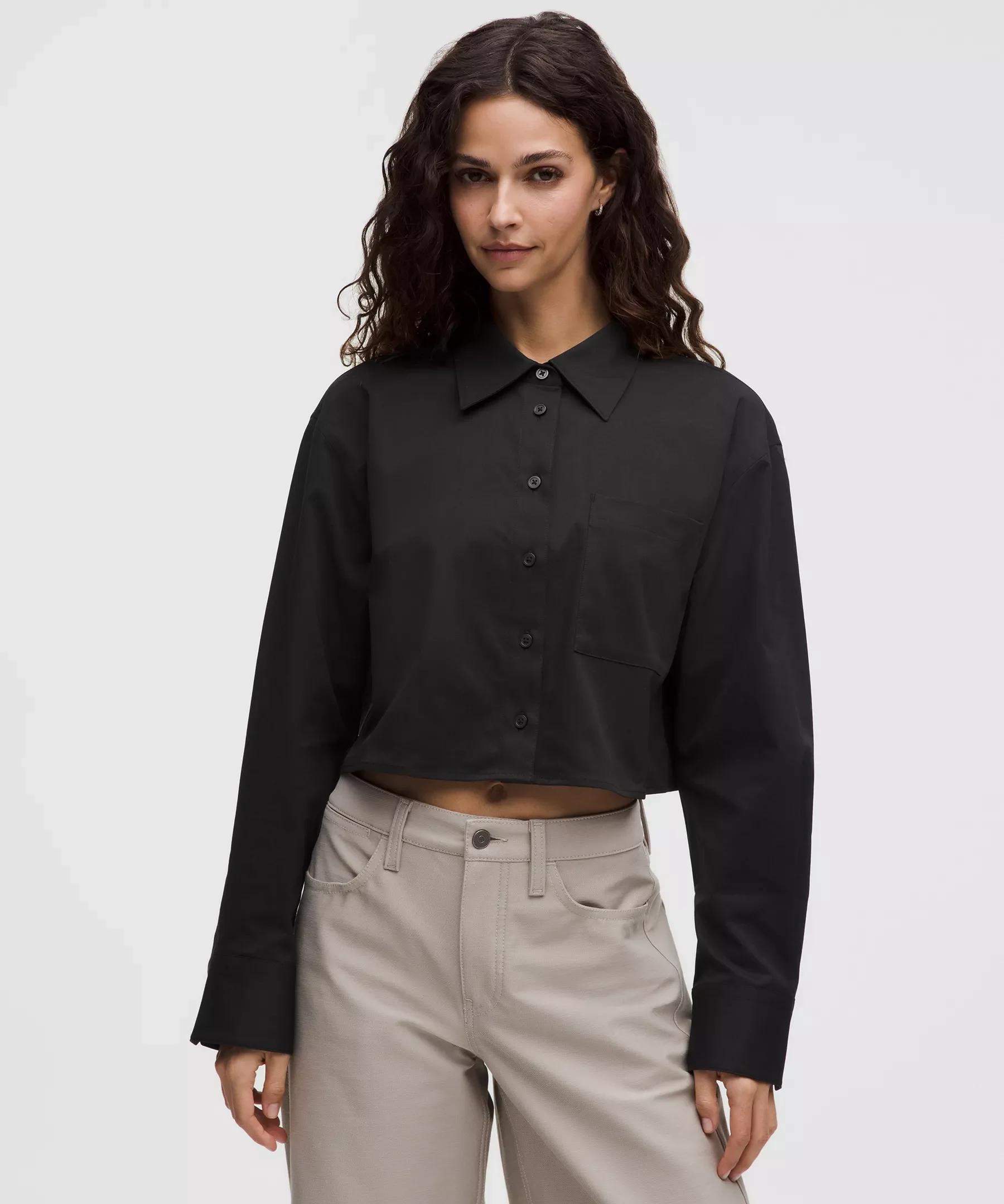 Woven Cropped Button-Up Long-Sleeve Shirt