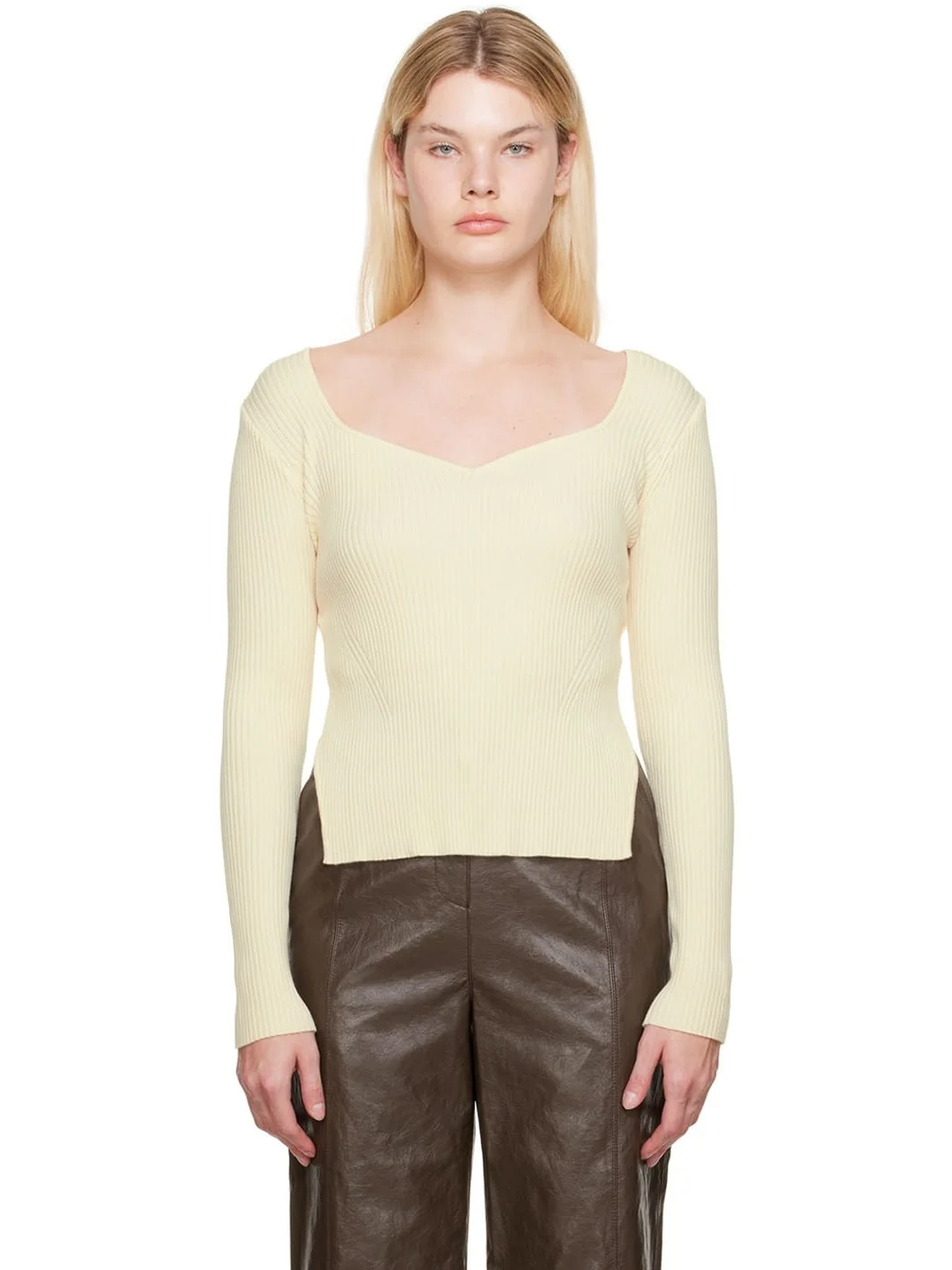 Rib knit polyester-blend sweater. · V-neck · Cropped back hem Supplier color: Cream 62% polyester, 38% poly elite. Made in South Korea 222428F100004