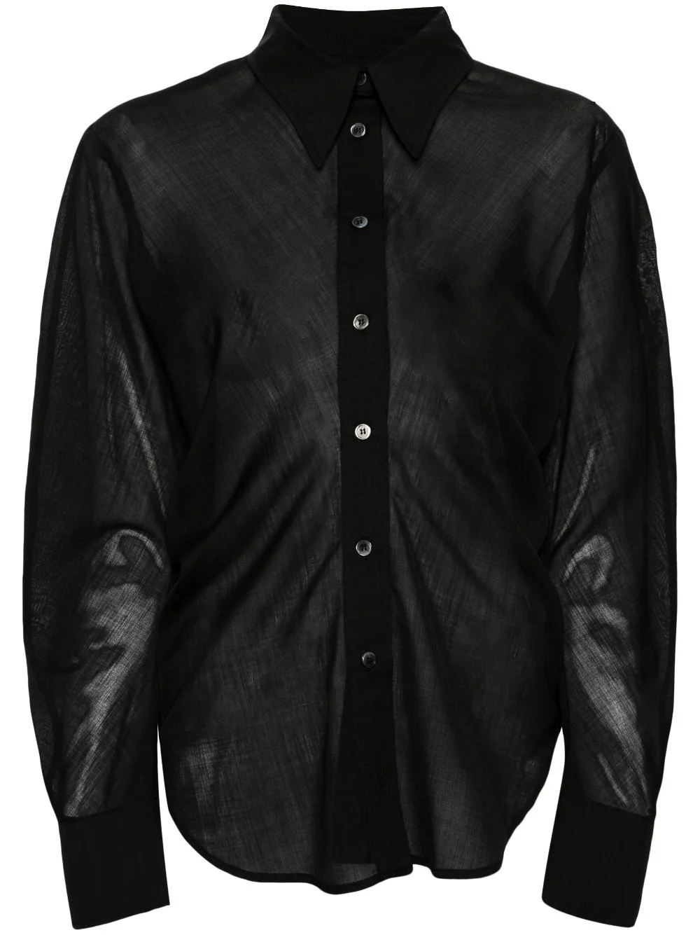semi-sheer wool blend shirt Highlights - Black - Wool blend - Semi-sheer construction - Pointed flat collar - Front button fastening - Drop shoulder - Long sleeves with buttoned cuffs - Curved hem - Slim cut Imported Composition Polyester 50%, Wool 50% Washing instructions Dry Clean Only
