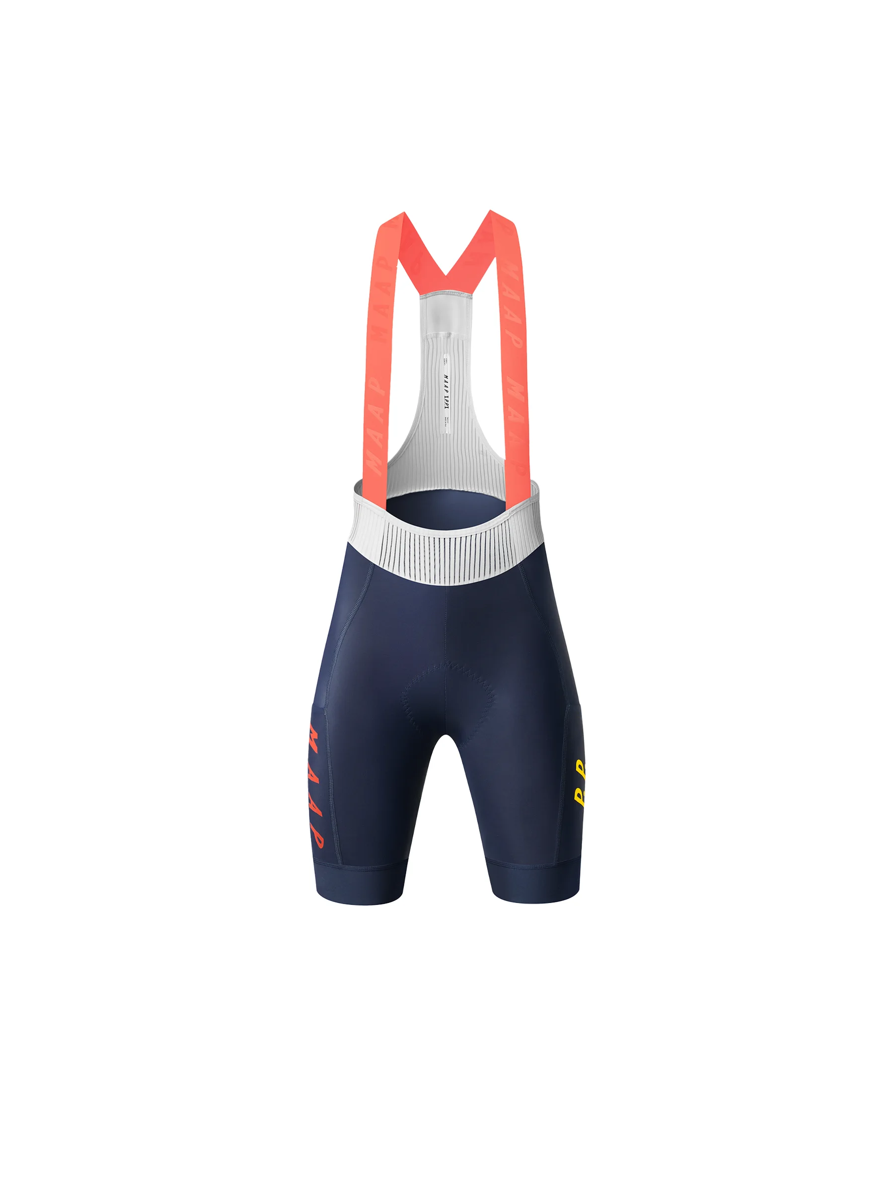 The MAAP + Public Possession Team Bib Evo Cargo integrates dual low-profile cargo pockets for secure, bounce-free storage. Engineered with MAAP's advanced anatomic multi-density chamois and abrasion-resistant materials, ready for long rides and perfect rhythm. Details - Moisture Wicking - Breathable - 4 Way Stretch - bluesign® APPROVED Fabric - Italian Fabric - Reflective Graphics Features - Experience ultimate all-day comfort with MAAP's 3D Thermo Moulded chamois, featuring Eco X-tract fabric and breathable anatomical construction. - Additional on-the-go storage is seamlessly integrated with dual-sided cargo pockets on our high-performance lightweight bib. - Long-lasting wear with optimal stretch, recovery and shape retention throughout the main body fabric. - Optimal breathability for uncompromised performance with a high-airflow mesh back. - Ensuring the leg hem stays firmly in place with an elasticated hem band with a silicone gripper. - Pressure points are relieved for unrivalled comfort through a seamless bib and brace. - Extra visibility in low light conditions with reflective print transfers and tabs. Specifications - Product Weight: 260g - Main Fabric Content: 80% Polyamide, 20% Elastane - Fit: Race - Temperature Range: 15 - 40 DEGREES - Riding Conditions: All Year - SKU: MPWBS252125_NAVY