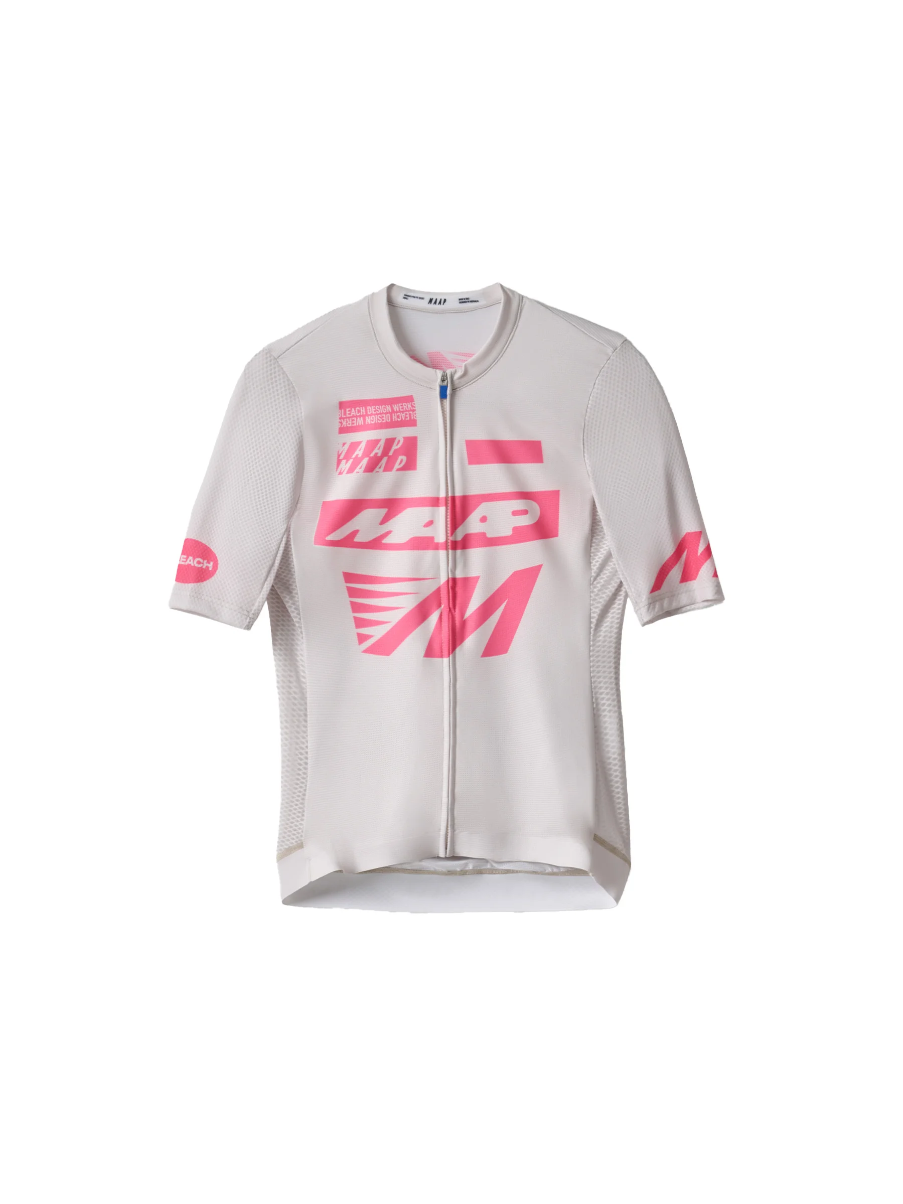 The MAAP x Bleach Women’s Pro Air Jersey blends Mike Ojeda's distinctive design ethos with his love of cycling. The lightweight, performance-driven jersey combines moisture-wicking technology with breathable fabrics. Engineered for maximum airflow and optimised cooling for uncompromised performance. Details - Recycled Yarns - Moisture Wicking - Lightweight Features - The high-performance silhouette of our Race Fit features a longer sleeve length, low-profile collar and tailored panelling for speed and precision. - Optimal airflow in warmer conditions with micro-perforated fabrics engineered with majority recycled yarns. - Advanced strength and enhanced comfort combine with the carbon yarn warp-knit sleeve. - No bulk and an elevated fit from the bonded front hem construction. - Keeping the jersey securely in place is an elasticated rear hem with an internal silicone logo print. Specifications - Product Weight: 150 g - Main Fabric Content: 90% Recycled Polyester, 10% Elastane - Fit: Race - Temperature Range: 20 - 40 DEGREES - Riding Conditions: Hot - SKU: MPWJE220424_WTCR