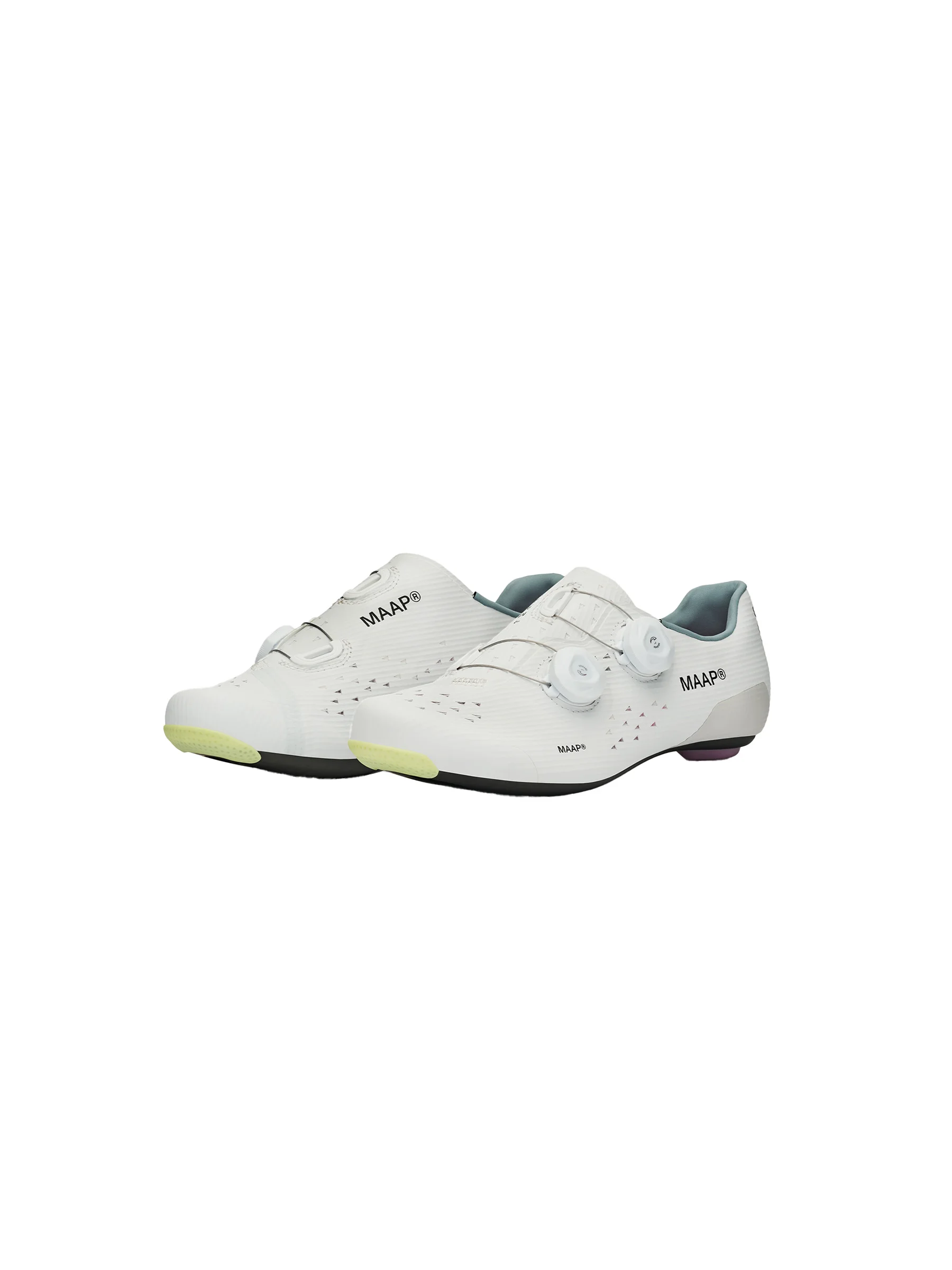The limited-edition MAAP x QUOC M3 Pro is a performance-driven, race-ready road shoe. Engineered carbon-fibre soles deliver stiffness for efficient power transfer, and parallel dual dials provide a secure precision fit. QUOC's advanced technologies meet MAAP's signature design elements and exclusive finishes. Features - The ultra-lightweight, multi-layered TPU upper is foot-moulding, providing optimised comfort and features a texturised pinstripe for increased stability and structure. - MAAP-exclusive triangular laser-cut perforations deliver optimal aeration and breathability. - QUOC Technology dual dials bring micro-adjustability and a precision fit, paired with the innovative tongueless wrap design for elevated comfort and natural foot flexion. - Delivering exceptional stiffness-to-weight ratio and optimised power transfer with no loss of effort through QUOC's race-grade unidirectional carbon outsole with laser-etched MAAP branding. - MAAP exclusive colourway rubberised heel and toe plates enhance protection and provide lasting performance. - Enhanced durability comes from a reinforced TPU toe guard and heel counters, which resist the scuffs and scratches that come with regular wear in racing and training. - Finished in exclusive MAAP colourways, QUOC’s race-grade insoles feature pressure-relieving, vibration-absorbing technology plus interchangeable arch supports for a custom fit. Specifications - Product Weight: 242g in EU 42 - Main Fabric Content: Upper: TPU laminated mesh, Sole: Handlaid, unidirectional carbon fibre - Riding Conditions: All Year - SKU: MAUFW250325_WHIT