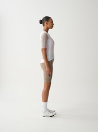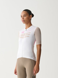 The Women's Eclipse Pro Air Jersey 2.0 is here to give you the confidence to accelerate forward. The ultra-lightweight compression fit jersey combines moisture-wicking technology with a highly breathable mesh panelled construction. Engineered to regulate body temperature and maximise airflow to ensure performance and comfort is always dialled, even when the temperature and tempo are rising. Details - Recycled Yarns - Moisture Wicking - Lightweight Features - Warp-knit sleeves combined with carbon yarn technology provide advanced strength and advanced comfort. - The bonded front-hem construction reduces bulk for an elevated fit. - Details matter, the YKK zip features a locking tab mechanism to ensure no sliding zippers. Specifications - Product Weight: 150 g - Main Fabric Content: 90% Recycled Polyester, 10% Elastane - Fit: Race - Temperature Range: 20-40 DEGREES - Riding Conditions: Hot - SKU: MPWJE202024_WHIT