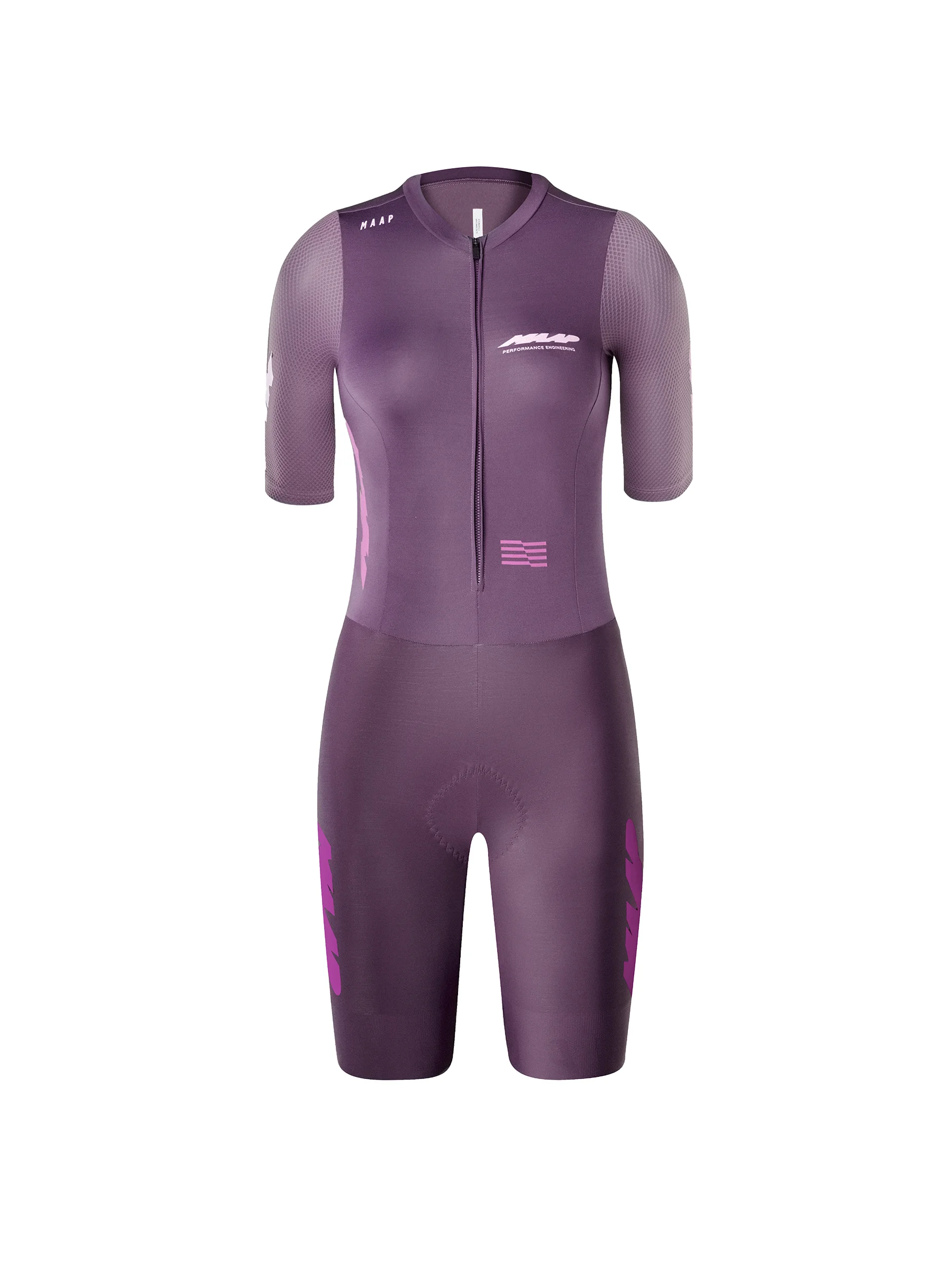 Chasing speed starts here. The Eclipse Pro Race Suit delivers aerodynamic shaping and a compressive fit designed to keep you efficient when it matters, under pressure, or in the red, engineered for the moments that define the race. Details - 4 Way Stretch - Compression Fabrics - Breathable - Moisture Wicking - Reflective Graphics - Italian Fabric - Recycled Yarns Features - A seamless fit and enhanced traction with the raw cut leg hem and internal low-profile silicone gripper. - Considered storage with minimal bulk through compact dual rear pockets. - Amping up ventilation and ensuring quick nature breaks with a two-way zipper for Women. - Sustainably preferred materials are featured on the upper body and sleeve fabrics. - Experience ultimate comfort with MAAP's 3D Thermo Moulded chamois, featuring Eco X-tract fabric and breathable anatomical construction. Specifications - Product Weight: 260g - Main Fabric Content: Main Body: 70% Polyamide (Recycled), 30% Elastane, Sleeves: 78% Polyamide (Recycled), 22% Elastane, Lower: 80% Polyamide, 20% Elastane - Fit: Race - Temperature Range: 18 - 35 DEGREES - Riding Conditions: Hot - SKU: MPWSK250225_BERY