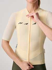 Our best-selling jersey keeps getting better. The Women's Evade Pro Base Jersey 2.0 has been re-imagined with a range of sustainable materials and fresh design details for a jersey that fits so well you'll forget you're wearing it. Ultra-soft fabrics paired with advanced moisture-wicking technology keep you cool and dry even when the pace is on. Details - Recycled Yarns - MAAP Honeycomb - Moisture Wicking - bluesign® APPROVED Fabric - Breathable Features - The signature Race Fit features a longer sleeve length, low profile collar and tailored panelling for a high-performance silhouette - Recycled dyed honeycomb mesh sleeves provide advanced breathability - A bonded front-hem and rear pocket edge construction reduces bulk for an elevated fit - A back side zip stash pocket keeps your cash, keys and other valuables secure - Reflective print transfers and tabs for extra visibility in low light conditions Specifications - Product Weight: 135 g - 4.76 oz - Main Fabric Content: MAIN BODY: 70% POLYAMIDE (RECYCLED), 30% ELASTANE, SLEEVES: 78% POLYAMIDE (RECYCLED), 22% ELASTANE - Fit: Race - Temperature Range: 18-35 DEGREES - Riding Conditions: Hot - SKU: MAP-WAJ283_SDST
