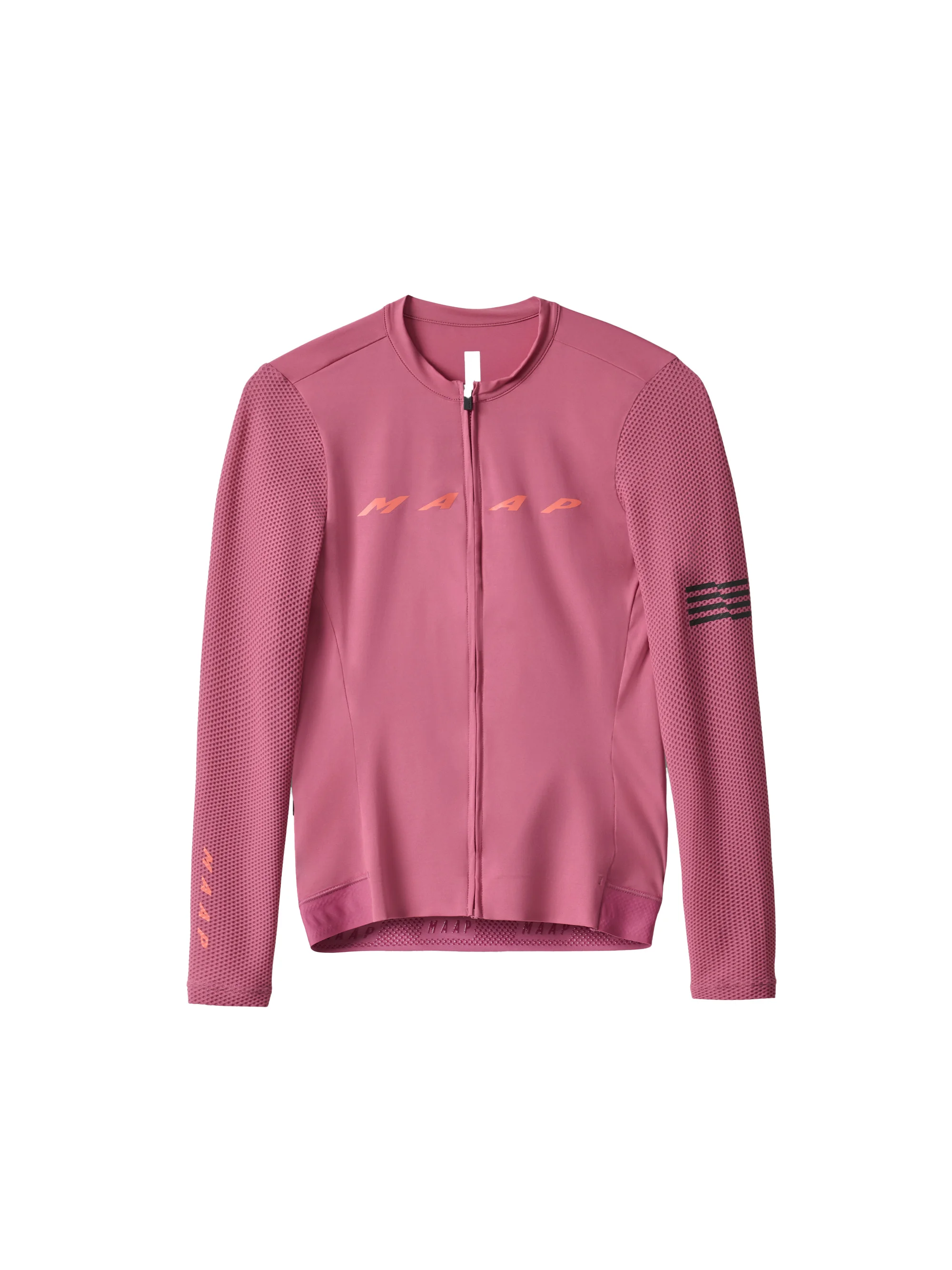 Our best-selling Women's Evade Pro Base Long Sleeve Jersey 2.0 is made with sustainable materials and ultra-soft, moisture-wicking fabrics. Designed for a fit so comfortable, you'll forget you’re wearing it- even when the pace heats up. Details - Recycled Yarns - MAAP Honeycomb - Moisture Wicking - bluesign® APPROVED Fabric - Breathable - Reflective Graphics - Italian Fabric Features - The high-performance silhouette of our Race Fit features advanced sleeve fit, low-profile collar and tailored panelling for speed and precision. - Advanced breathability achieved through premium recycled honeycomb mesh sleeves. - More secure storage and an elevated fit with streamlined bonded front hem and rear pocket-edge construction. - Additional storage with a sleek and secure low-profile internal rear zip pocket. - Extra visibility in low light conditions with reflective print transfers and tabs. Specifications - Product Weight: 180 g - Main Fabric Content: MAIN BODY: 70% POLYAMIDE (RECYCLED), 30% ELASTANE, SLEEVES: 78% POLYAMIDE (RECYCLED), 22% ELASTANE - Fit: Race - Temperature Range: 18 - 35 DEGREES - Riding Conditions: Hot - SKU: MPWLS190325_MAUV