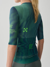 The Women's Privateer Russell Finsterwald Pro Air Jersey 3.0 delivers amplified aeration with strategically placed open mesh zones optimising breathability in warmer weather. The soft-to-skin advanced fabric architecture is lighter, cooler and dialled to perform. Details - Moisture Wicking - Lightweight - Breathable - 4 Way Stretch - Recycled Yarns - Italian Fabric Features - Optimised airflow with open mesh sleeves and micro-perforated fabrics, designed for warmer weather. - Minimised construction and added stability with a wider bonded front hem. - A sleek and stable back pocket system with a bonded pocket edge. - Secure storage for small essentials with an added zippered stash pocket. Specifications - Product Weight: 150 g - Main Fabric Content: Main: 89% Recycled Polyester 11% Elastane, Sleeves: 96% Recycled Polyester 4% Elastane, Side Panel: 94% Recycled Polyester 6% Elastane - Fit: Race - Temperature Range: 22 - 40 DEGREES - Riding Conditions: Hot - SKU: MPWJE253725_GREN