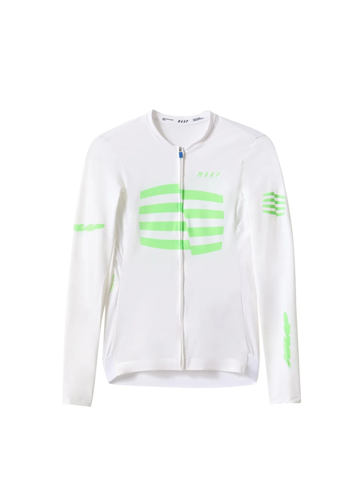 The Women's Sphere Pro Hex Long Sleeve Jersey 2.0 is designed to perform on your longest training days and hardest race days. A lightweight jersey in our signature Race-Fit style, it features contoured panelling and a low-profile collar that offers all-day comfort and a high-performance fit. Made from a majority of recycled yarns, the Women's Sphere Pro Hex Long Sleeve Jersey features an exclusive MAAP hex-tech long sleeve for aero optimisation alongside breathable micro-perforated fabric on the back and side panels. The Women's Sphere Pro Hex Long Sleeve Jersey 2.0 is ready to ride with an upgraded bonded front hem and larger pockets with anti-sag material. Details - Recycled Yarns - Compression Fabrics - Moisture Wicking - Made with majority recycled yarns - Upgraded bonded front-hem construction - Signature Race-Fit with woven exclusive MAAP Hex-tech sleeve technology - Micro-perforated breathable fabric for the back panel, side panels, and collar - Moisture-wicking technology - Longer sleeve length with twin-needle sleeve hem - Larger back pockets with breathable anti-sag fabric - Single-layer lightweight elastic hem with internal silicone print - YKK zip with lock-zip puller - Fabrics sustainably manufactured with the bluesign® SYSTEM - Elastic hem band OEKO-TEX® certified Specifications - Product Weight: 125 g - 4.41 oz - Main Fabric Content: Front Panel: 85% RECYCLED POLYESTER 15% RECYCLED ELASTANE, Rear Panel: 90% RECYCLED POLYESTER 10% RECYCLED ELASTANE, Sleeve: 75% POLYESTER 25% ELASTANE - Fit: Race - Temperature Range: 18-35 DEGREES - Riding Conditions: Hot - SKU: MAP-WAL128_WHT