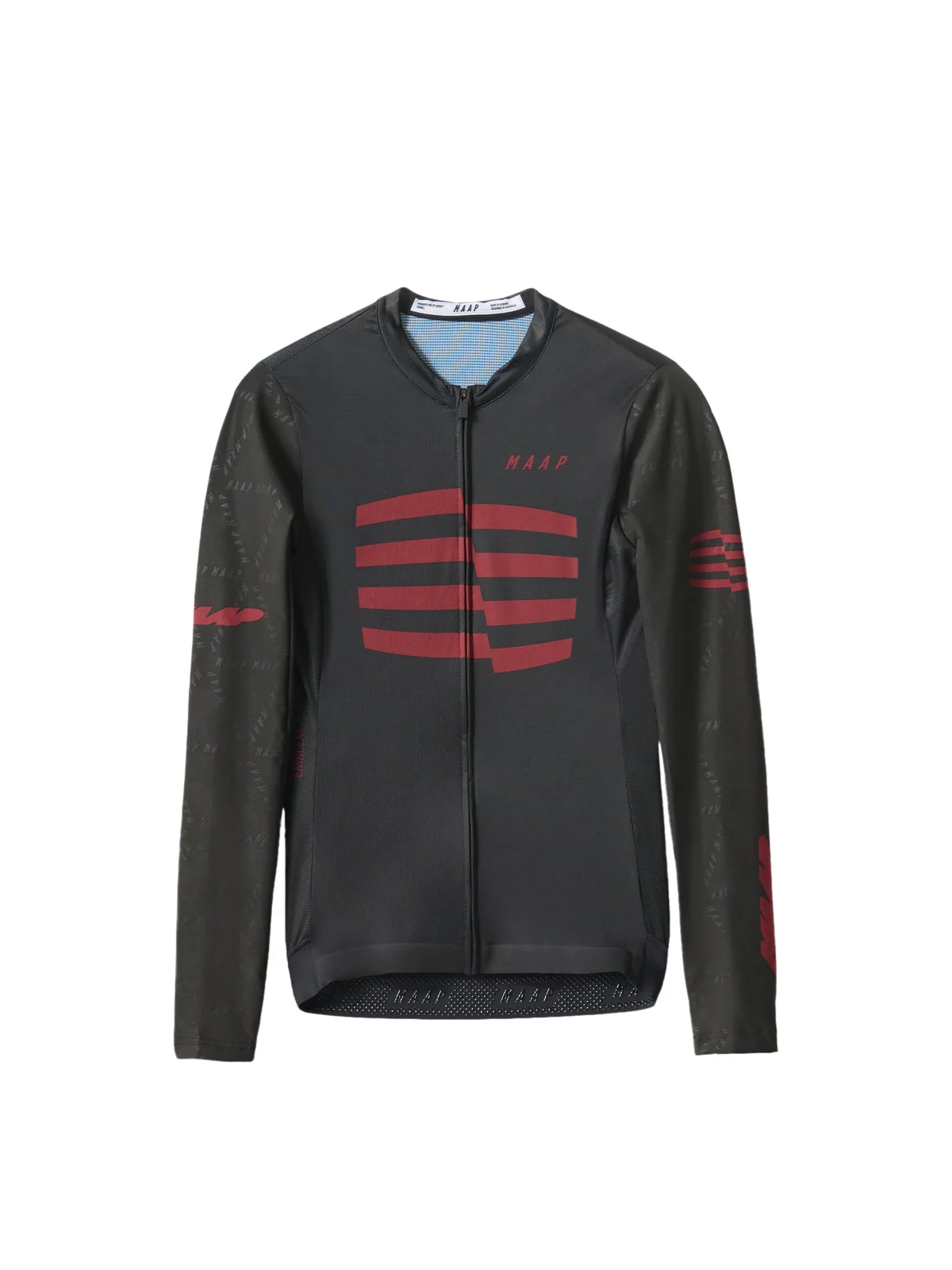 The Women's Sphere Pro Hex Long Sleeve Jersey 2.0 is designed to perform on your longest training days and hardest race days. A lightweight jersey in our signature Race-Fit style, it features contoured panelling and a low-profile collar that offers all-day comfort and a high-performance fit. Made from a majority of recycled yarns, the Women's Sphere Pro Hex Long Sleeve Jersey features an exclusive MAAP hex-tech long sleeve for aero optimisation alongside breathable micro-perforated fabric on the back and side panels. The Women's Sphere Pro Hex Long Sleeve Jersey 2.0 is ready to ride with an upgraded bonded front hem and larger pockets with anti-sag material. Details - Recycled Yarns - Compression Fabrics - Moisture Wicking - Made with majority recycled yarns - Upgraded bonded front-hem construction - Signature Race-Fit with woven exclusive MAAP Hex-tech sleeve technology - Micro-perforated breathable fabric for the back panel, side panels, and collar - Moisture-wicking technology - Longer sleeve length with twin-needle sleeve hem - Larger back pockets with breathable anti-sag fabric - Single-layer lightweight elastic hem with internal silicone print - YKK zip with lock-zip puller - Fabrics sustainably manufactured with the bluesign® SYSTEM - Elastic hem band OEKO-TEX® certified Specifications - Product Weight: 125 g - 4.41 oz - Main Fabric Content: Front Panel: 85% RECYCLED POLYESTER 15% RECYCLED ELASTANE, Rear Panel: 90% RECYCLED POLYESTER 10% RECYCLED ELASTANE, Sleeve: 75% POLYESTER 25% ELASTANE - Fit: Race - Temperature Range: 18-35 DEGREES - Riding Conditions: Hot - SKU: MAP-WAL129_BLK