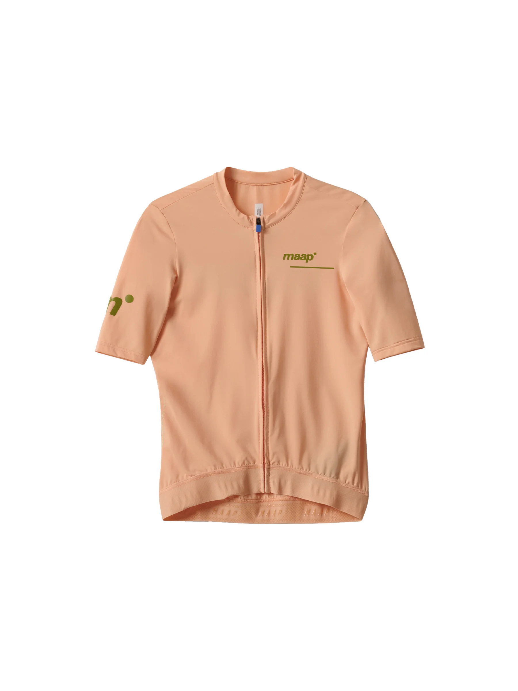 Maximise every session with the Women's Training Jersey. Engineered for the demands of long days in the saddle and intense intervals, it blends ultra-soft, durable recycled fabrics with moisture-wicking technology, ensuring you stay comfortable ride after ride. Details - Recycled Yarns - Moisture Wicking - Italian Fabric - UPF 50+ Protection - bluesign® APPROVED Fabric Features - The streamlined silhouette of our Stretch Fit features softer materials for long-lasting comfort and ease of movement without compromising on performance. - No fuss and secure zip placement with a YKK Vision zip lock. - Secure storage for keys or cash with the zippered stash rear pocket. - Reduced bulk and an elevated fit with a bonded low-profile rear pocket edge. - Comfort and sustainability unite with recycled ultra-soft knitted Italian fabrics aligned with MAAP's commitment to sustainability. Specifications - Product Weight: 150 g - Main Fabric Content: 70% Polyamide (Recycled), 30% Elastane - Fit: Core - Temperature Range: 18 - 35 DEGREES - Riding Conditions: Hot - SKU: MPWJE224424_PECH