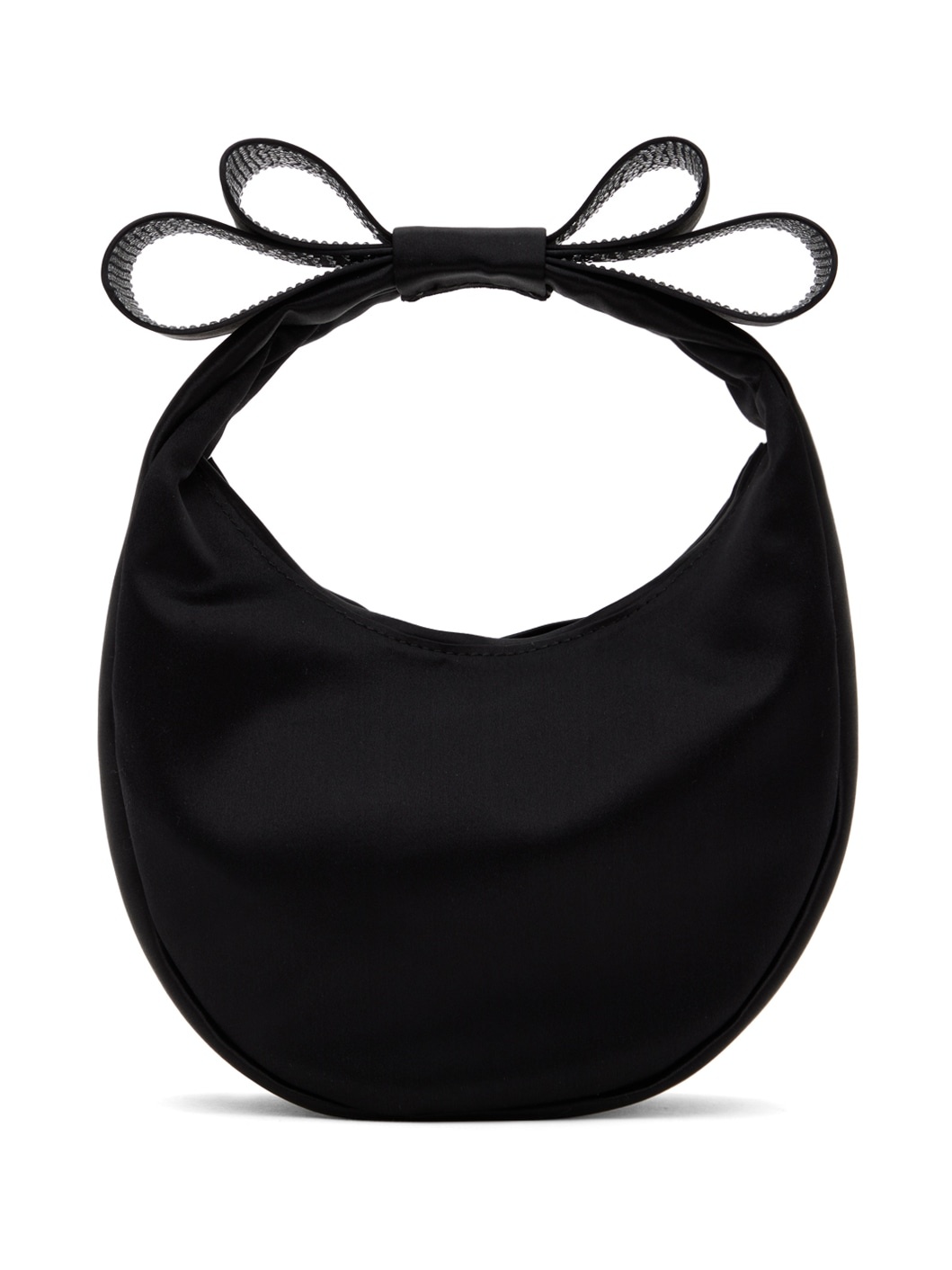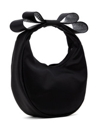 Satin top handle bag in black. Crystal-cut graphic applique at fixed carry handle. · Crystal-cut graphic applique at side · Zip closure · Patch pocket at interior · Twill lining · Logo-engraved silver-tone hardware · H5" x W8" x D3" Supplier color: Black Textile. Made in Italy 241404F046014