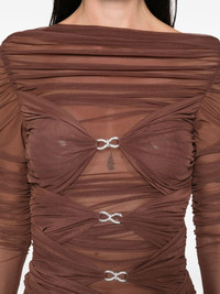 crystal-embellished draped dress Highlights - Brown - Sheer mesh - Draped fabric - Long sleeves - Crystal embellishments - Asymmetrical hem Made in Italy Composition Polyester 92%, Lycra 8% SIZE & FIT Model measurements Height 5 ft 10 in(1.78 m) Bust/Chest 33.46 in(85 cm) Hips 36.22 in(92 cm) Waist 23.22 in(59 cm) Washing instructions Dry Clean Only