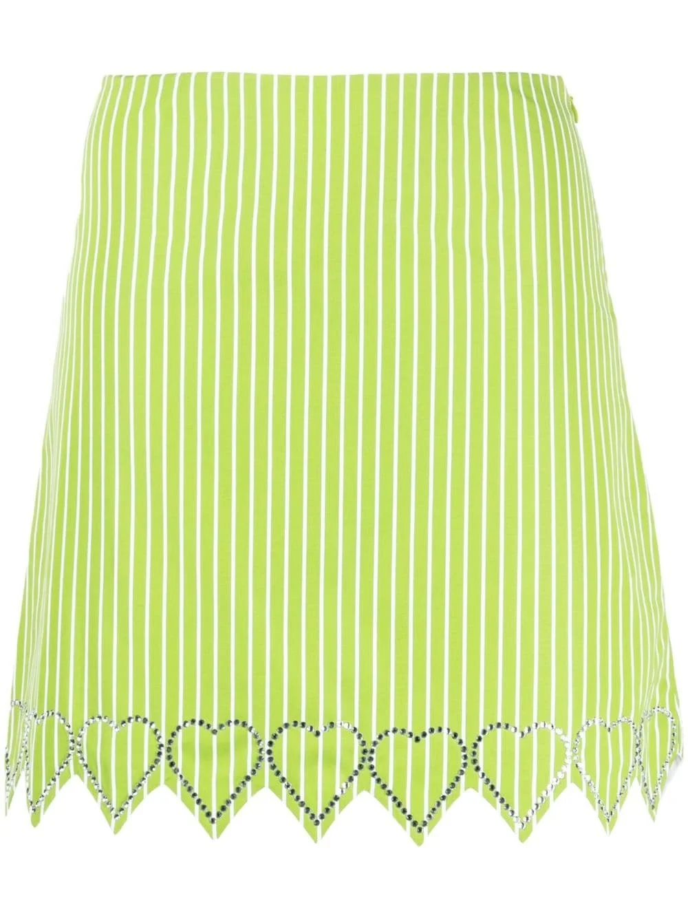 crystal-embellished scalloped miniskirt MACH & MACH introduces a love heart motif for SS23. It appears here in a crystal-embellished iteration along the hem, glimmering in contrast to the green colourway of the thigh-length silhouette. Highlights - Light green/white - Cotton - Vertical stripe print - Glass crystal embellishment - Heart motif - Concealed side zip fastening - Scallop hem - Above-knee length Made in Italy Composition Cotton 100% SIZE & FIT Model measurements Height 5 ft 10 in(1.78 m) Bust/Chest 30.31 in(77 cm) Hips 34.64 in(88 cm) Waist 24.01 in(61 cm) FittingInformation This mini-length skirt is intended to be worn high on the waist Made from a midweight non-stretch fabric This piece fits true to size – take your usual size Washing instructions Machine Wash