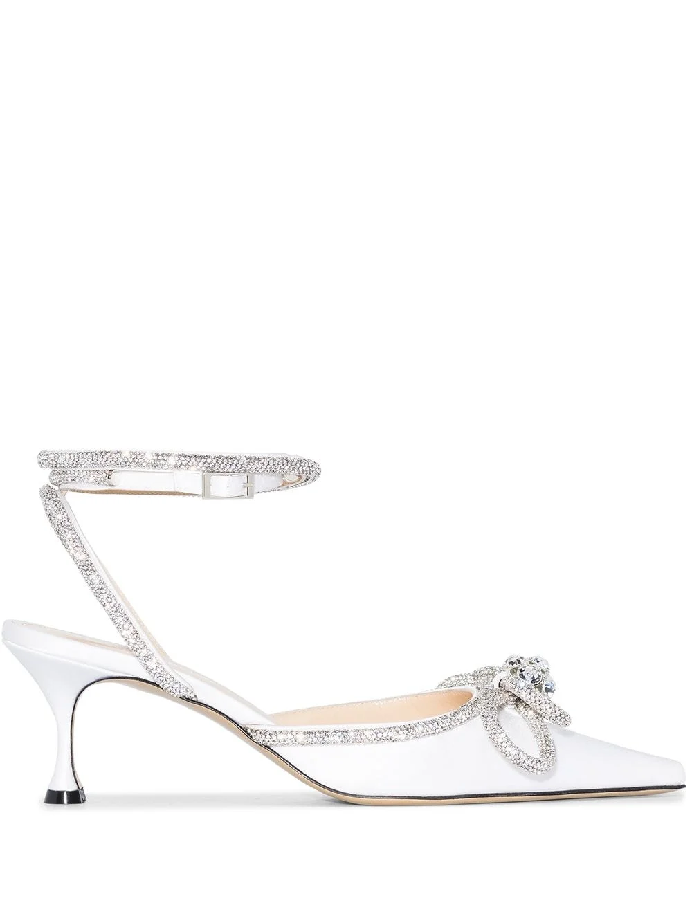 Double Bow 65mm leather pumps Georgian footwear brand MACH & MACH creates eye-catching silhouettes for statement looks. Crafted from leather in a versatile white shade, the Double Bow pumps are adorned with glistening crystals and a bow detail at the front. With a pointed toe for a sharp shape, they fasten at the ankle with a buckle and sit atop a stiletto heel. Made in Italy Composition Lining: Leather 100% Sole: Leather 100% Outer: Fabric 100% SIZE & FIT Model measurements Height 5 ft 8 in(1.73 m) Bust/Chest 33.07 in(84 cm) Hips 35.03 in(89 cm) Waist 24.8 in(63 cm) FittingInformation This piece fits true to size. We recommend you get your regular size Measurement HEEL 2.55 in(6.5 cm) Sole height 0.39 in(1 cm)