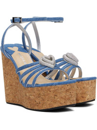 Denim heeled sandals in blue. · Open square toe · Straps and crystal-cut graphic hardware at vamp · Pin-buckle ankle strap · Logo stamp at padded footbed · Grained leather lining · Cork wedge heel and platform midsole · Treaded rubber sole · Platform: H2" · Heel: H4.75" Supplier color: Blue Upper: textile. Sole: leather, rubber. Made in Italy 251404F125018