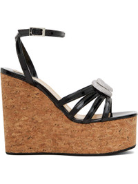 Patent leather heeled sandals in black. · Open square toe · Straps and crystal-cut graphic hardware at vamp · Pin-buckle ankle strap · Logo stamp at padded footbed · Grained leather lining · Cork wedge heel and platform midsole · Treaded rubber sole · Platform: H2" · Heel: H4.75" Supplier color: Black Upper: leather. Sole: cork, rubber. Made in Italy 251404F125017