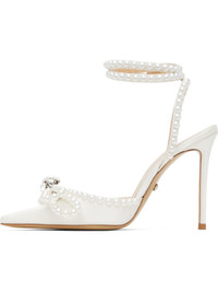 Satin heels in white. · Faux-pearl accents throughout · Pointed toe · Bow with crystal-cut accent at vamp · Wraparound pin-buckle ankle strap · Logo stamp at padded leather footbed · Buffed leather lining · Covered stiletto heel with rubber injection · Leather sole · Heel: H4" Supplier color: White