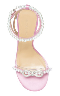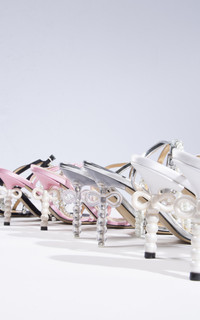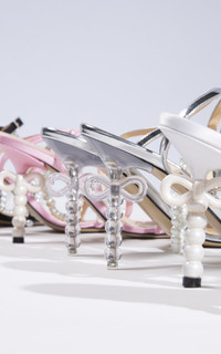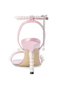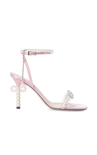 PRODUCT DETAILS - Rounded toe sandal silhouette, pearl embellished toe with crystal bow, satin body, stiletto heel surrounded by opaque bow and ball embellishments, buckle strap with detachable pearl anklet, fully lined - Buckle fastening - Composition: Satin - Professionally clean - Made in Italy SIZE & FIT - Heel height measures approximately 3.75"