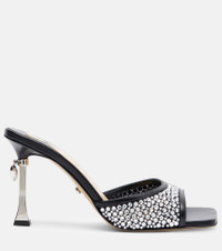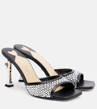 Fusing high-octane glamour with unabashed confidence, Mach & Mach creates mesmerizing shoes. Crafted from embellished leather, the Puffy Heart Ring mules owe their name to the charming logo-engraved pendants on their 95mm heels. Product Details - Upper: leather, fabric - Lining: leather - Sole: leather insole and sole - Toe shape: square open toe - Made in Italy - Includes: shoe box - Designer color name: Black/Crystal - Item color: black - Item number: P01044025 Size & Fit - True to size - European sizes - 9,5cm-3.5" heel (size EU 38)
