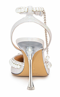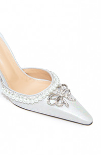 PRODUCT DETAILS - Pointed-toe silhouette, pearl leather body, pearl embellished double ankle strap, pearl and crystal framed upper, crystal looped bow embellishment on toe-box, slim stiletto silver-tone heel, fully lined - Ankle fastening - Composition: leather - Professionally clean - Made in Italy SIZE & FIT - Heel height measures 100 mm
