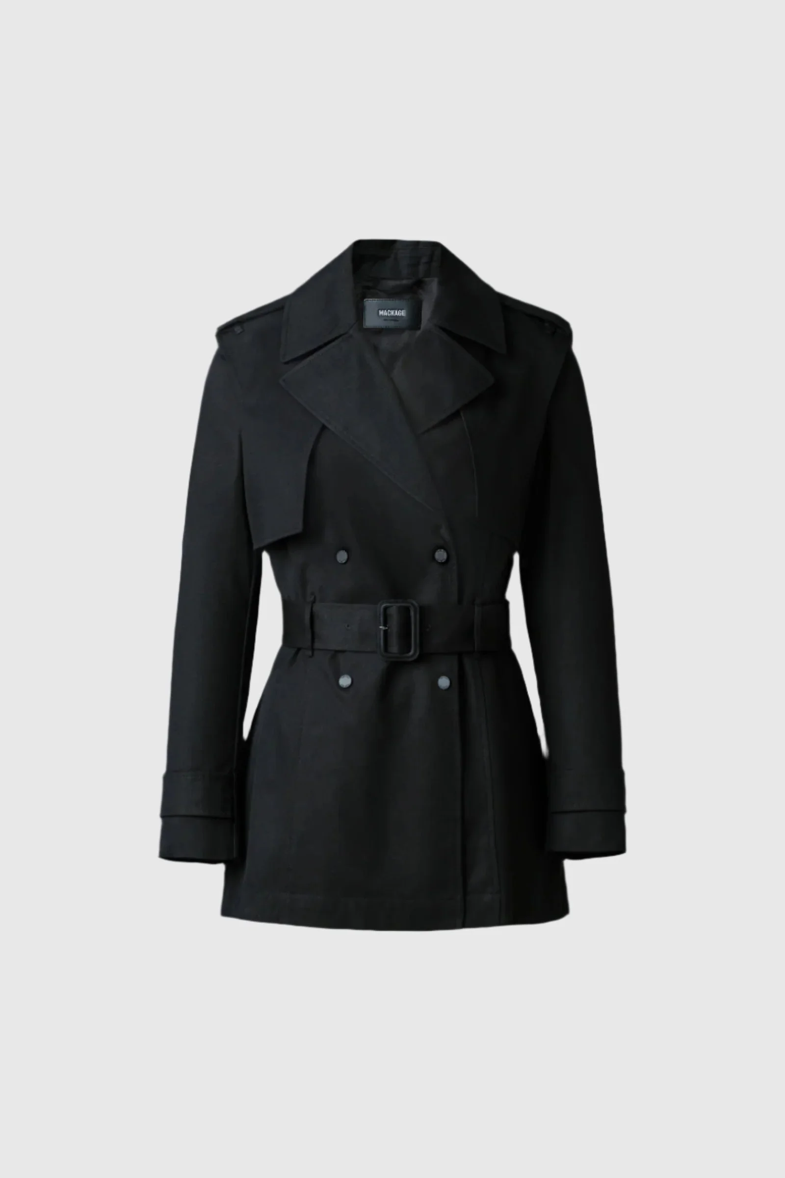 ADVA is a mid-length trench coat crafted from cotton-blend twill. Wide notched lapel, epaulette shoulders, and rainshedder add classic styling throughout. The mid-length semi-fitted silhouette is structured by a removable belt and pleated peplum. A luxe piece with classic style. DETAILS - Mid-length twill trench coat - Double-breasted snap closure - Wide notched lapel - Rainshedder at front and back - Removable buckle belt - Pleated peplum - Adjustable sleeve tabs with snaps - Epaulette shoulders - Hidden pocket under pleats - Water-repellent, resistant, and windproof - Partially lined - Semi-Fitted SIZE & FIT - SEMI-FITTED – Follows your body’s shape with ease. - Designed to be worn with light layers. - The model is 5'11" (180 cm) and wears a size XS. - Length from shoulder to hem: 29'' / 74 cm. COMPOSITION & CARE - Shell: 68% polyester, 32% cotton. Water-repellent & water-resistant. - Dry clean by leather specialist using oil based solvent only. Do not use perchloroethylene.