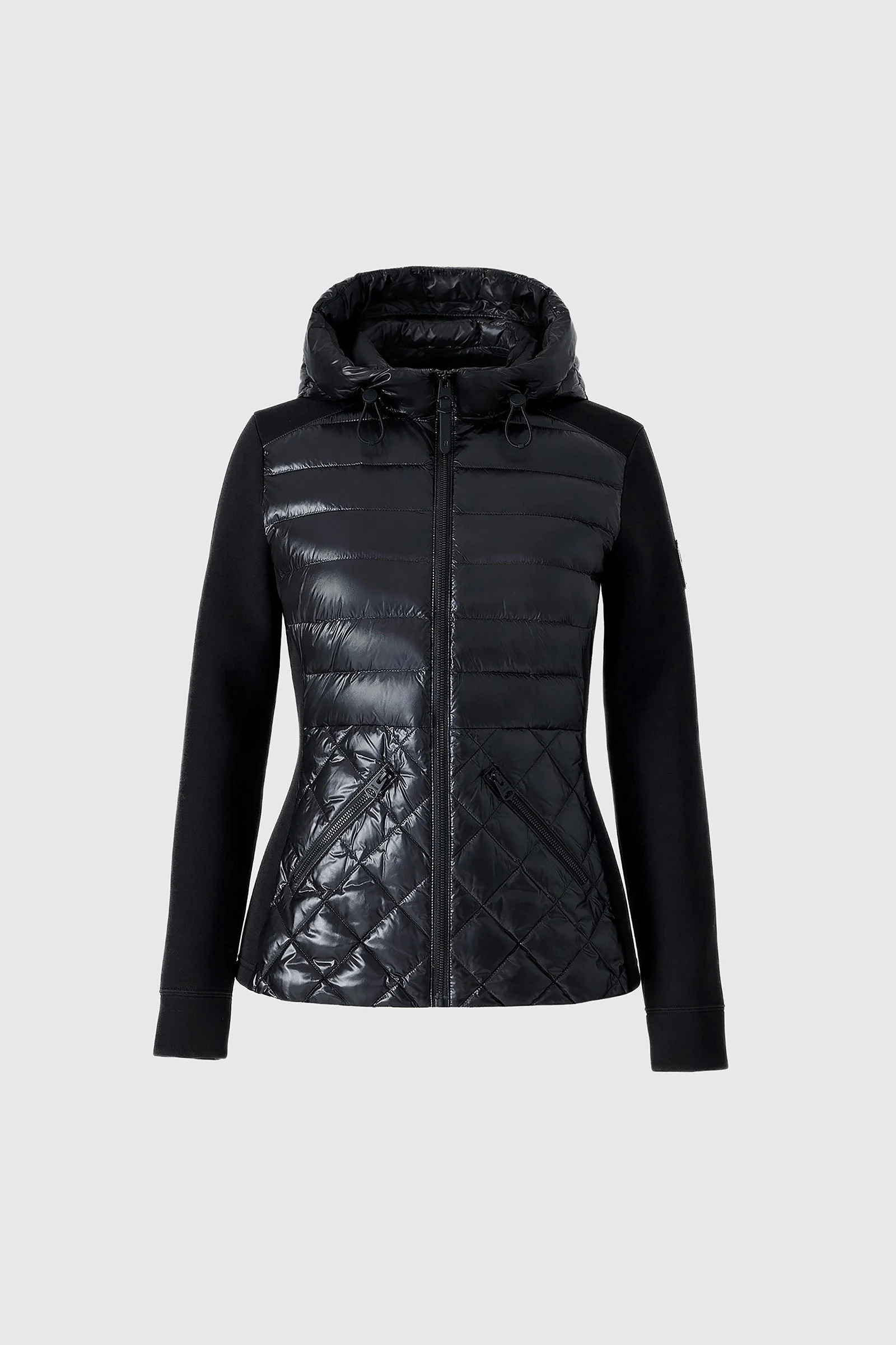 AGATHA is a fitted, mixed-media jacket with a quilted front body and diamond quilting at the waist. Made from recycled materials and filled with GRS-certified recycled down, it features an adjustable hood with bungee cord and stopper. The double-face jersey sleeves and back enhance comfort, while subtle branding on the sleeve and front zipper complete the design. DETAILS - Mixed-media hooded jacket - Water-resistant and repellent - Center front zipper closure - Adjustable hood opening with bungee cord and stopper - "M" logo on left sleeve - Double-face jersey back body and sleeves - Diamond quilting at waist - Quilted front body - Front body lined - GRS-certified recycled down - Recycled materials - Fitted silhouette - Machine washable SIZE & FIT - FITTED – Our signature fit, closest to the body. - Designed to be worn with light layers, all while keeping you warm. - For heavier layering, we recommend sizing up. - The model is 5'11" (180 cm) and wears a size S. - Coat length from shoulder to hem: 23.25'' / 59 cm. COMPOSITION & CARE - Shell: 53% cotton, 47% polyester. Lining: 100% recycled nylon. Filling: 90% recycled down, 10% recycled feathers. Water-repellent, water-resistant. - Close zippers. Remove fur. Remove all removable trims. Wash inside out. Wash in domestic machine in water not exceeding 40°c, at normal setting. Use mild detergent. remove immediately after washing. Do not soak. Tumble dry low heat with tennis balls, until fully dried (1to 3 hours). Do not wet-clean. Do not bleach. Do not wring. Do not iron or press. Dry clean using oil based solvent only. Do not use perchloroethylene.