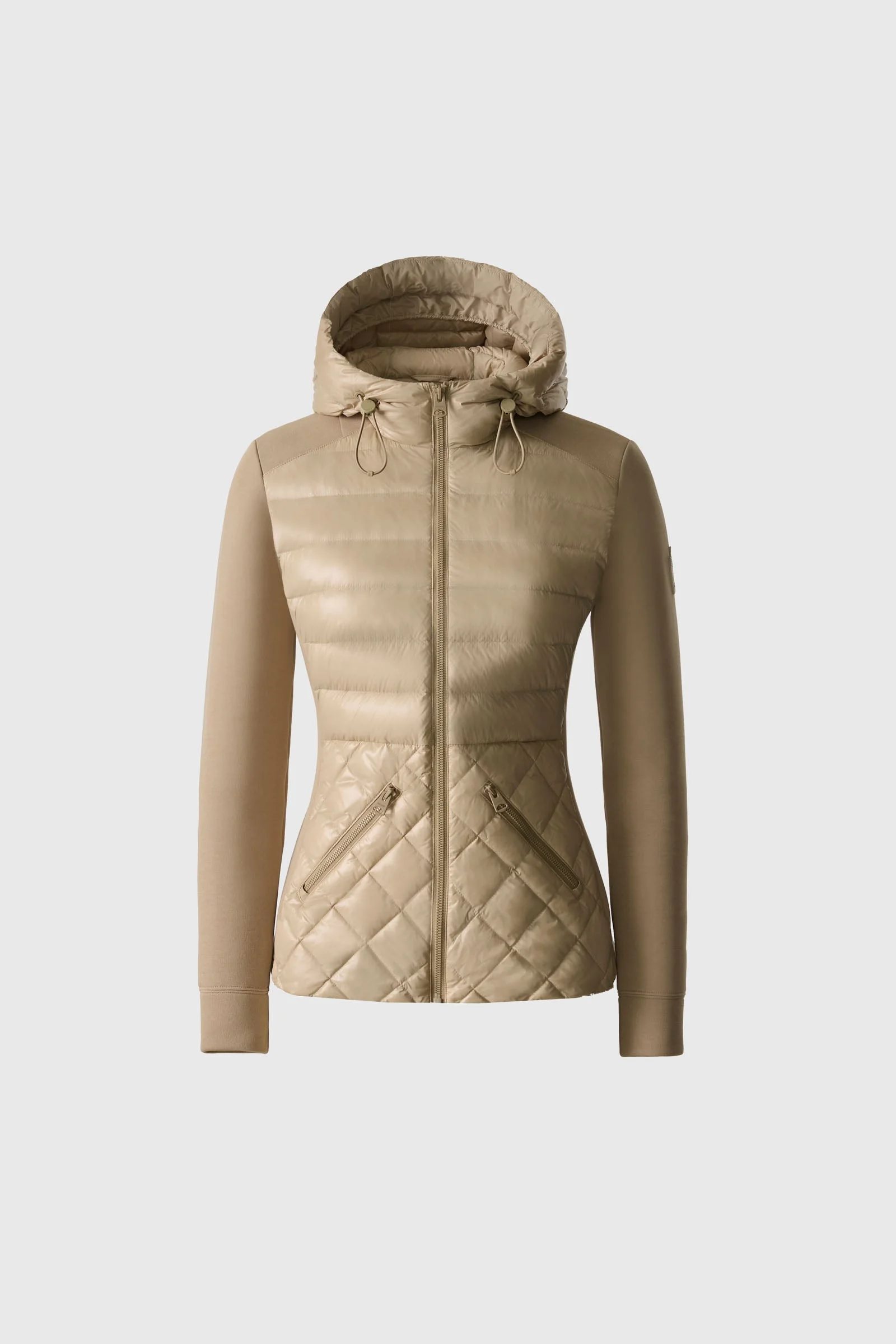 AGATHA is a fitted, mixed-media jacket with a quilted front body and diamond quilting at the waist. Made from recycled materials and filled with GRS-certified recycled down, it features an adjustable hood with bungee cord and stopper. The double-face jersey sleeves and back enhance comfort, while subtle branding on the sleeve and front zipper complete the design. DETAILS - Mixed-media hooded jacket - Water-resistant and repellent - Center front zipper closure - Adjustable hood opening with bungee cord and stopper - "M" logo on left sleeve - Double-face jersey back body and sleeves - Diamond quilting at waist - Quilted front body - Front body lined - GRS-certified recycled down - Recycled materials - Fitted silhouette - Machine washable SIZE & FIT - FITTED – Our signature fit, closest to the body. - Designed to be worn with light layers, all while keeping you warm. - For heavier layering, we recommend sizing up. - The model is 5'11" (180 cm) and wears a size S. - Coat length from shoulder to hem: 23.25'' / 59 cm. COMPOSITION & CARE - Shell: 53% cotton, 47% polyester. Lining: 100% recycled nylon. Filling: 90% recycled down, 10% recycled feathers. Water-repellent, water-resistant. - Close zippers. Remove fur. Remove all removable trims. Wash inside out. Wash in domestic machine in water not exceeding 40°c, at normal setting. Use mild detergent. remove immediately after washing. Do not soak. Tumble dry low heat with tennis balls, until fully dried (1to 3 hours). Do not wet-clean. Do not bleach. Do not wring. Do not iron or press. Dry clean using oil based solvent only. Do not use perchloroethylene.