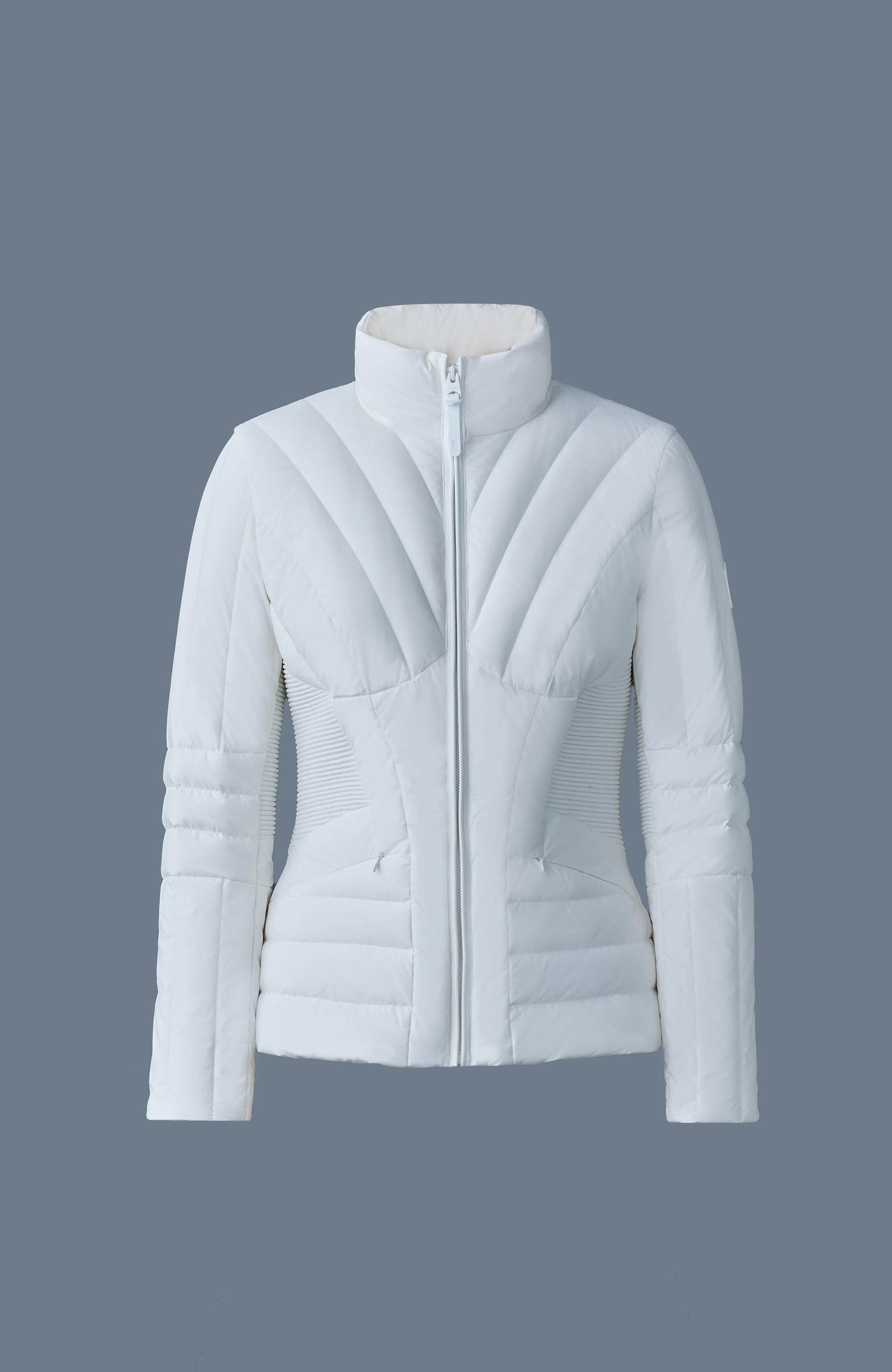 ALMA is a recycled light-down jacket cut with an Agile 360 stretch shell for ease of movement. Tailored to a fitted silhouette, the channel quilting and smocked elasticized detail enhance the cinched look. Insulated pockets and full lining offer extra warmth for colder days. Sleek and bold, a multi-season design with protective performance. - Light down jacket - Agile 360 stretch shell - GRS-certified recycled down - 2-way stretch shell - Novelty Channel quilting - Smocked elasticized detail - Stand collar - Inner pocket with zipper - Centre front zip closure - Insulated zip pockets at waist - Signature M logo patch on left sleeve - Fully lined - Fitted cut Down to -5°C SIZE & FIT - FITTED – Our signature fit, closest to the body. - Designed to be worn with light layers, all while keeping you warm. - For heavier layering, we recommend sizing up. - The model is 5'11" (180 cm) and wears a size XS. - Coat length from shoulder to hem: 24.5'' / 62 cm. COMPOSITION & CARE INSTRUCTIONS - Shell: 82% recycled nylon, 18% elastane/spandex. Lining: 82% recycled nylon, 18% elastane/spandex. Filling: 90% goose down, 10% feathers. Combo filling: 100% polyester. Water-repellent and water-resistant. - Dry clean by leather specialist using oil-based solvent only. Do not use perchloroethylene.