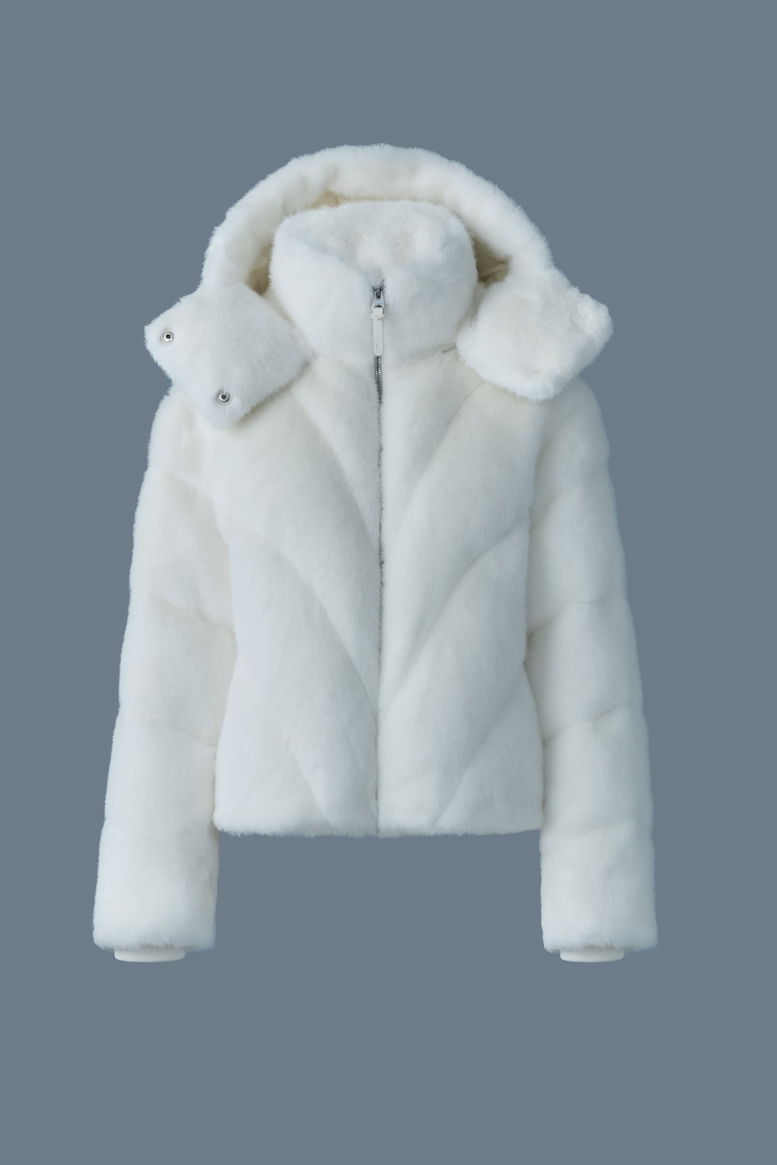ANIK is a down jacket constructed with incredibly soft brushed faux-fur shell. A cloud-like silhouette with high-performance details, the removable hood, rib knit storm cuffs, and insulated zip waist pockets lend adaptive warmth. Rounded graphic down channeling and adjustable drawcord at bottom hem add contrasting lines to the profile. - Down brushed faux-fur jacket - 750+ fill power - Traceable duck down - Rounded graphic down channeling - Removable hood - Centre front zip closure - Insulated zip waist pockets - Inside zip pocket - Signature M logo patch on left sleeve - Fully lined - Regular fit - Down to -15ºC SIZE & FIT - REGULAR – Classic fit allowing comfort and style. - Designed to be worn with heavier layers. - The model is 5'11" (180 cm) and wears a size XS. - Coat length from shoulder to hem: 22.5'' / 57 cm. COMPOSITION & CARE INSTRUCTIONS - Shell: 100% polyester. Lining: 100% recycled polyester. Filling: 90% duck down, 10% feathers. - Dry clean by leather specialist using oil-based solvent only. Do not use perchloroethylene.